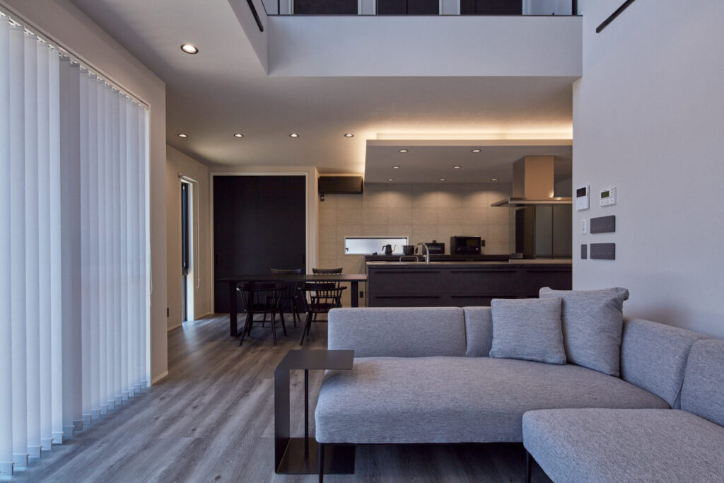 家全体を貫くLDKの吹き抜け空間は、2階の廊下から各部屋へとつながり、一体感のある住まいを実現しています。縦長の開放感あふれる空間は、視線の流れまで計算されたスタイリッシュなデザイン。どこにいても広がりを感じられる快適な住まいです。
