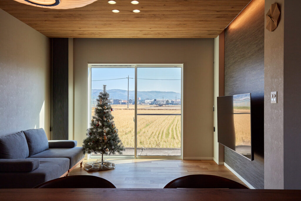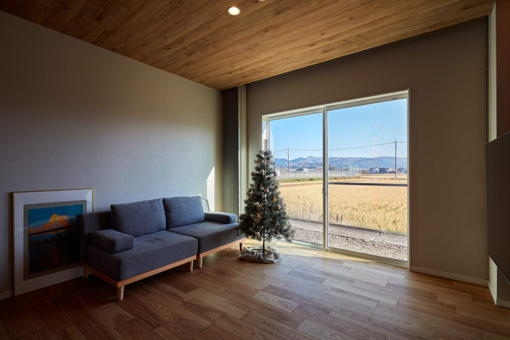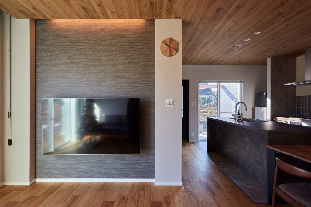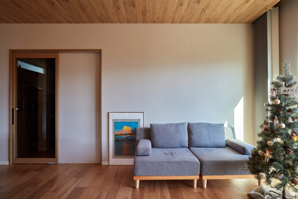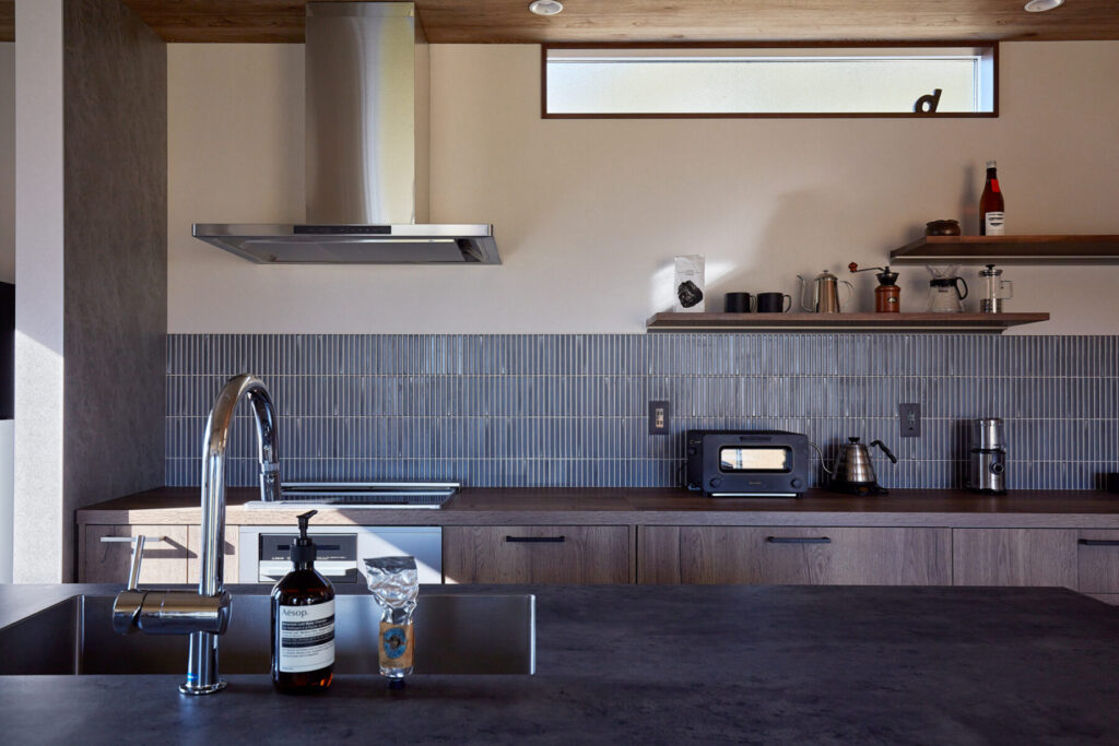 休日の朝、挽きたてのコーヒーの香りに包まれる平屋の暮らしをかなえました。カフェ風に仕上げたリビングは、コーヒー好きな夫婦にとっての憩いの場です。大きな窓から差し込む光と木のぬくもりが調和し、お気に入りのカフェのような心地よさに満たされます。