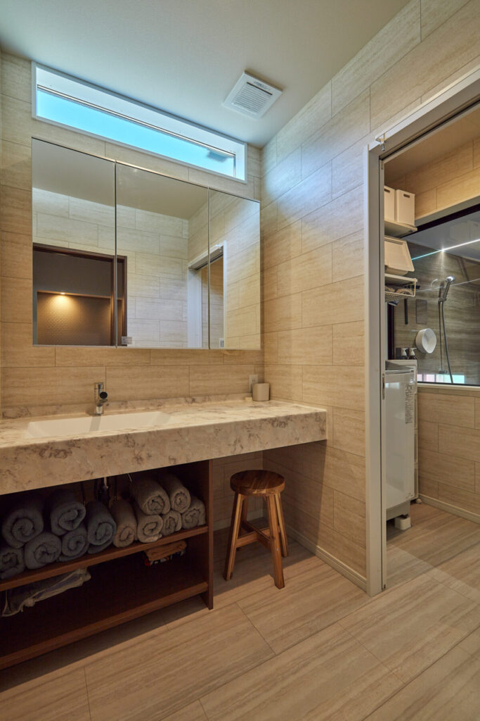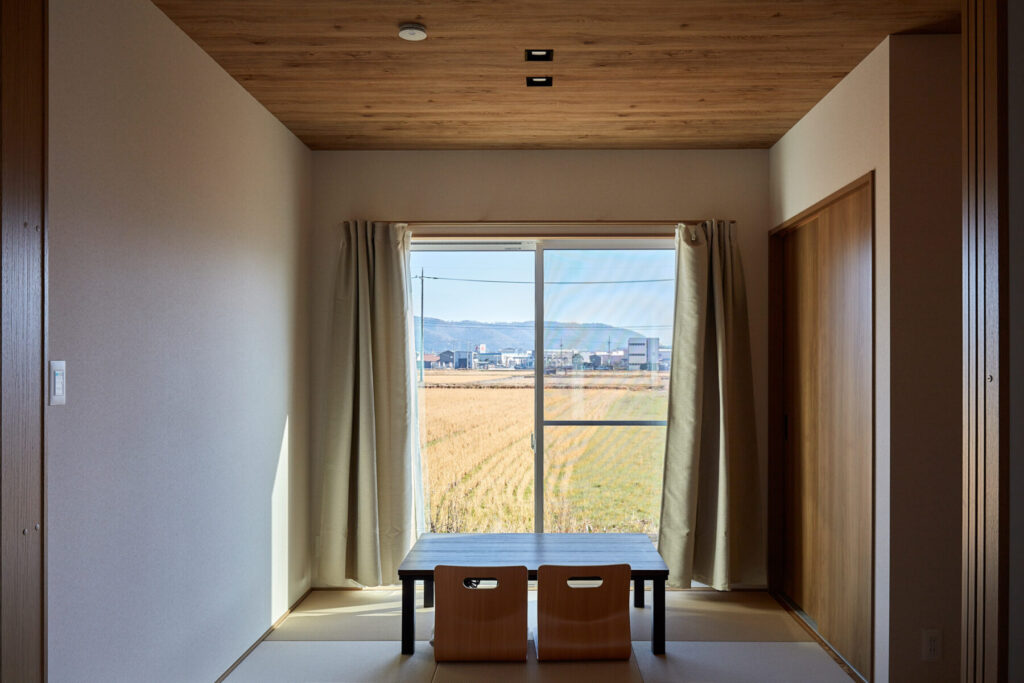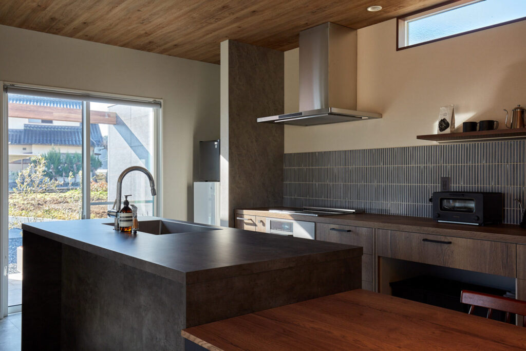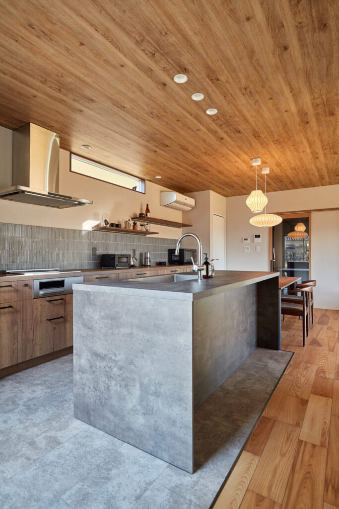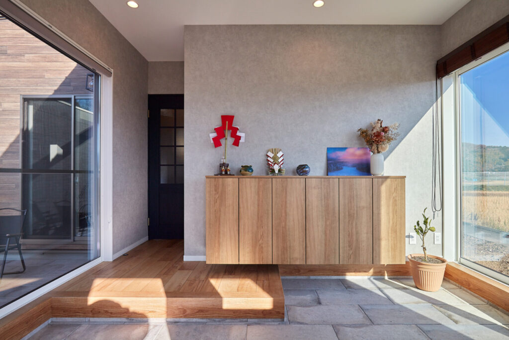 休日の朝、挽きたてのコーヒーの香りに包まれる平屋の暮らしをかなえました。カフェ風に仕上げたリビングは、コーヒー好きな夫婦にとっての憩いの場です。大きな窓から差し込む光と木のぬくもりが調和し、お気に入りのカフェのような心地よさに満たされます。