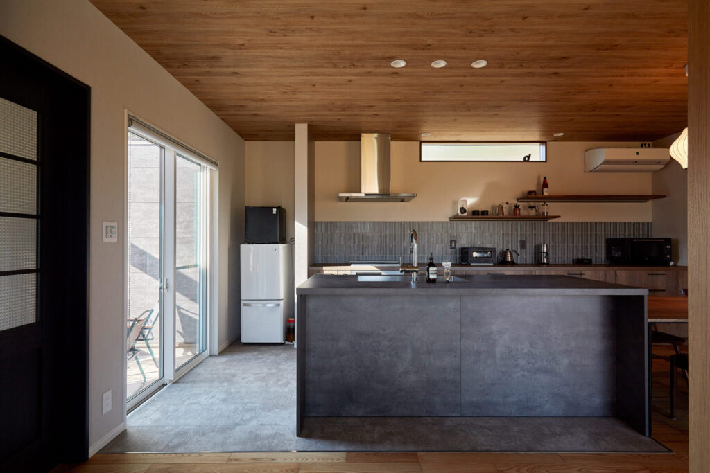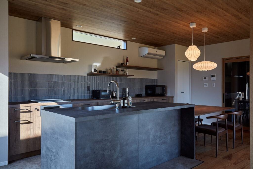 LDKには、床タイルとアイアン調のキッチンを採用し、天井や床には濃いめの木目を使用しています。異なる素材を組み合わせることで、空間に深みと表情をプラス。デザイナーズ照明のオレンジ色の明かりが、部屋全体をあたたかく包み込みます。
