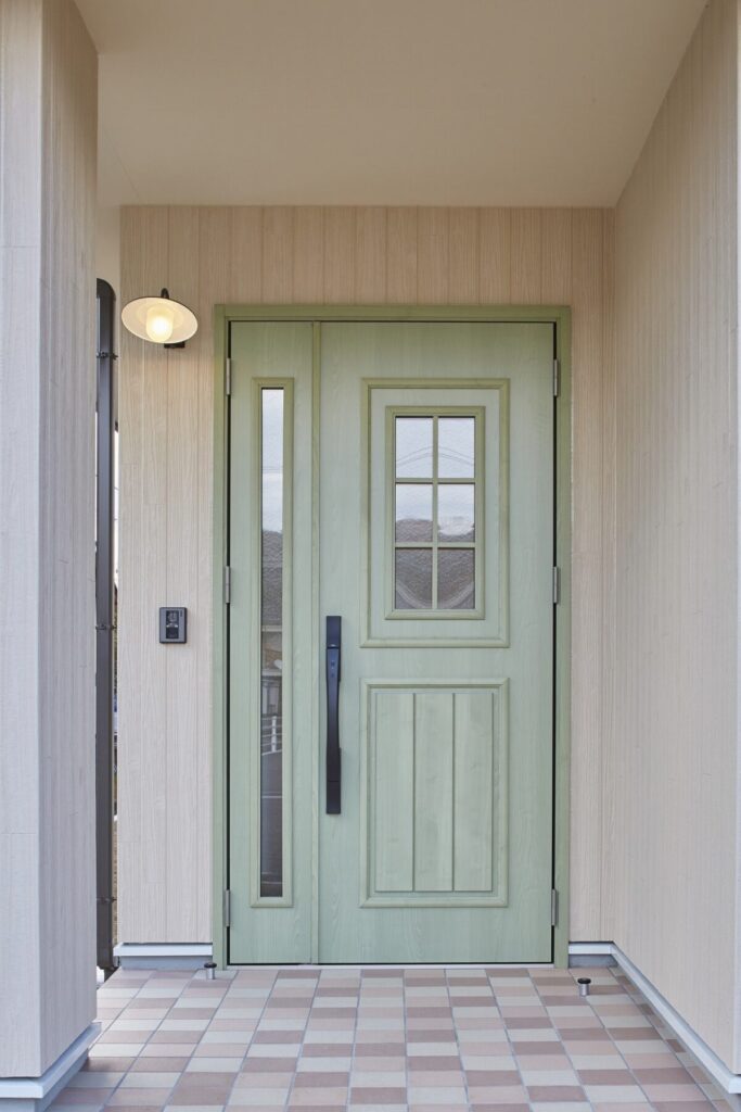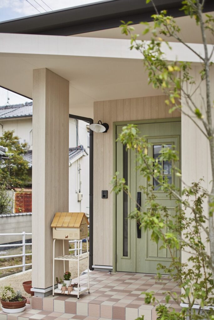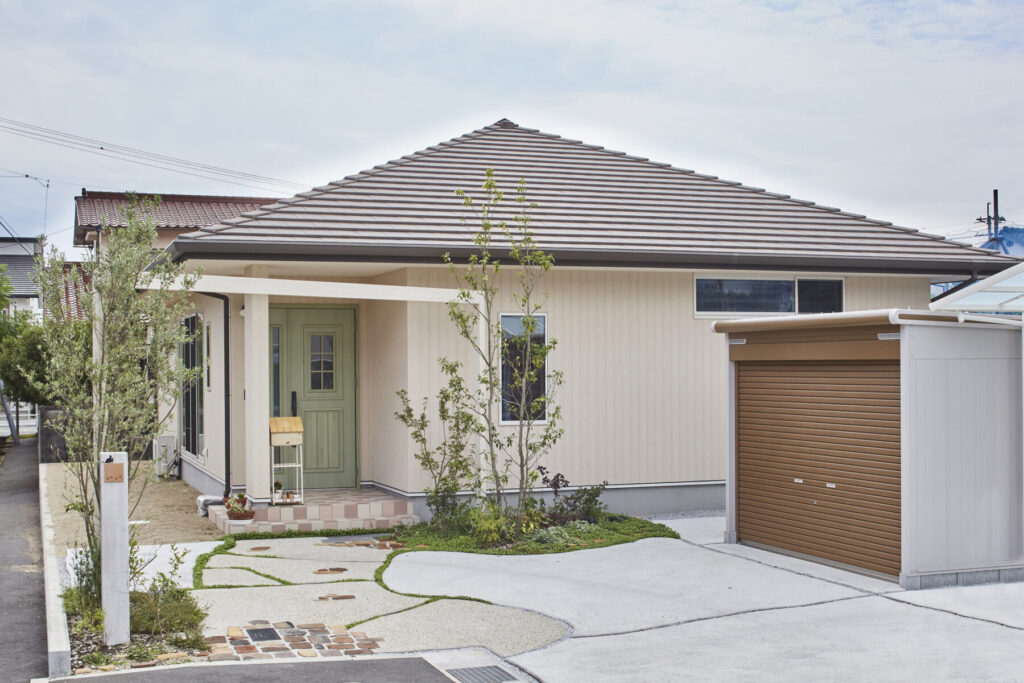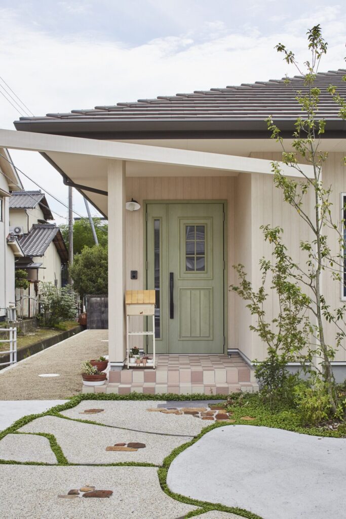 プロヴァンスの雰囲気をまとう住まいは、可愛らしいスモークグリーンの玄関扉がお出迎え。R形状の開口やレンガ調のタイル、植栽が絵本のような佇まいを演出します。ホワイトを基調とした内装は、明るく柔らかな空気感に包まれ、暮らしをやさしく彩る平屋です。
