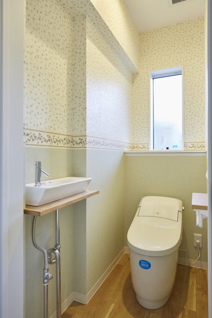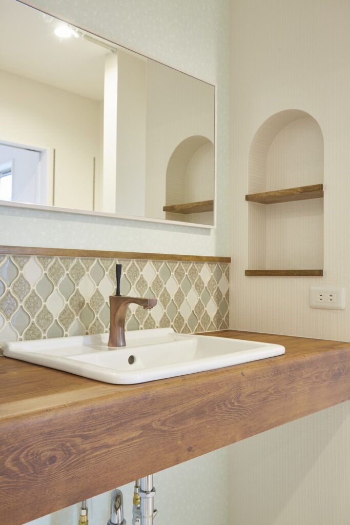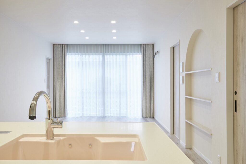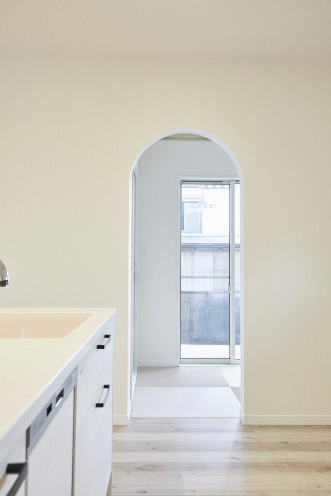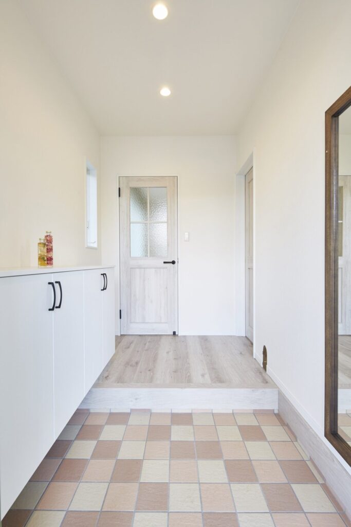 プロヴァンスの雰囲気をまとう住まいは、可愛らしいスモークグリーンの玄関扉がお出迎え。R形状の開口やレンガ調のタイル、植栽が絵本のような佇まいを演出します。ホワイトを基調とした内装は、明るく柔らかな空気感に包まれ、暮らしをやさしく彩る平屋です。
