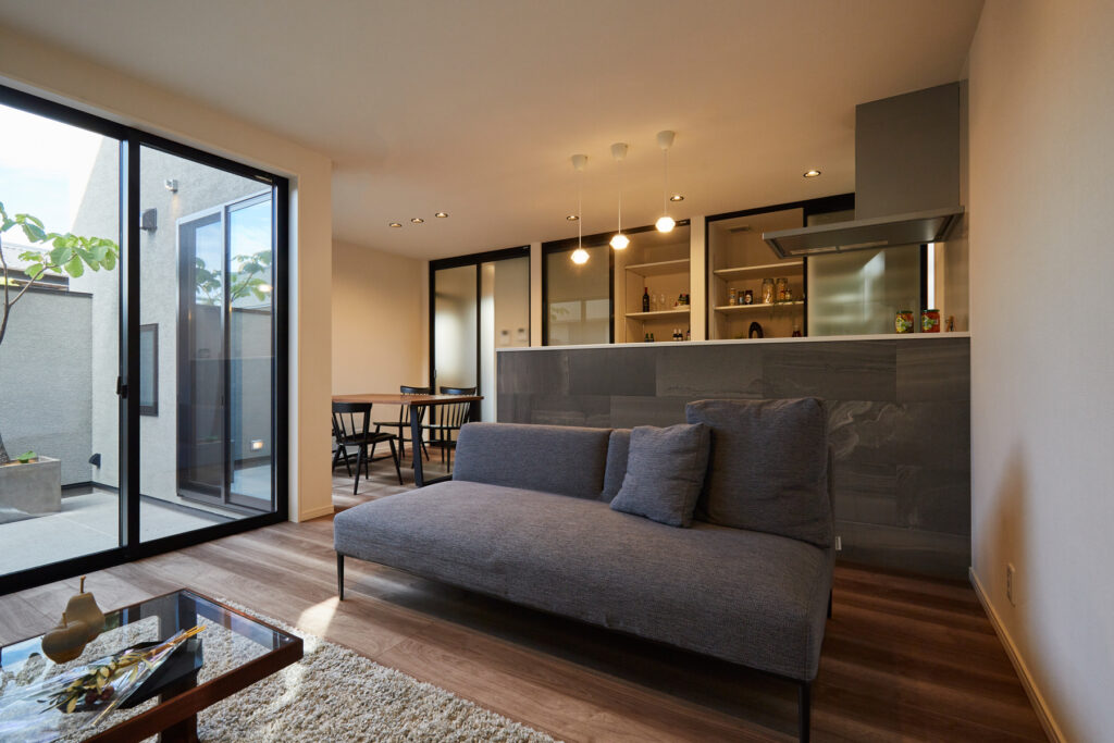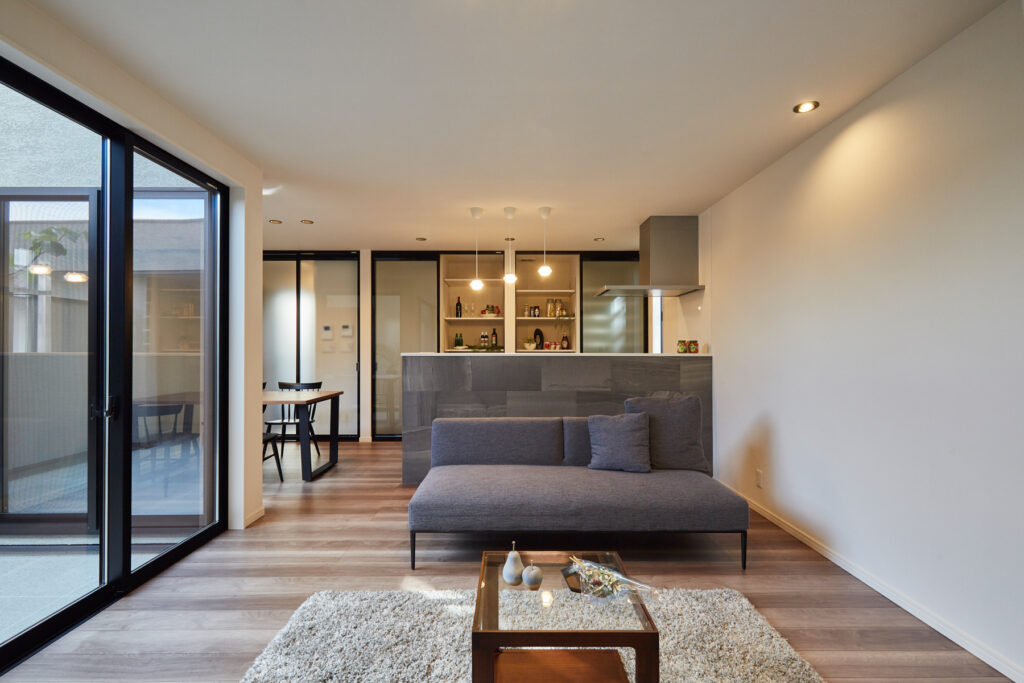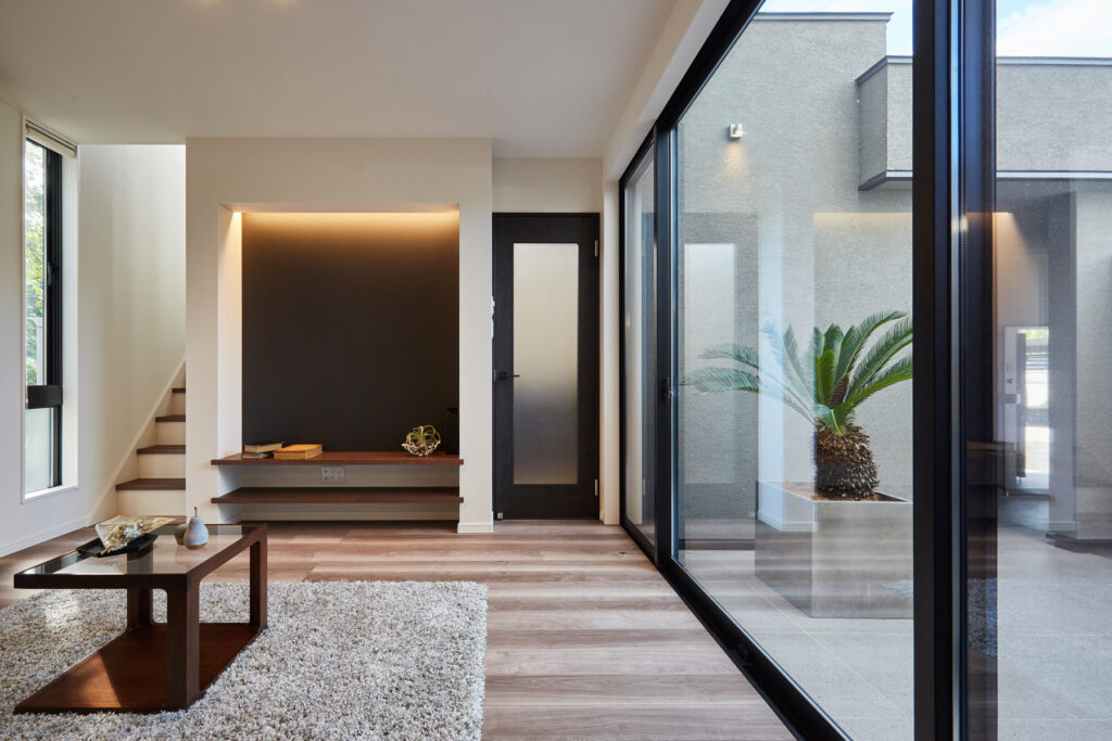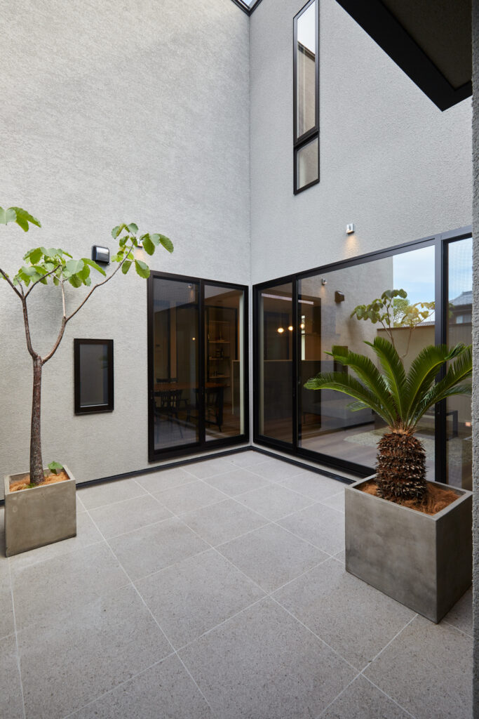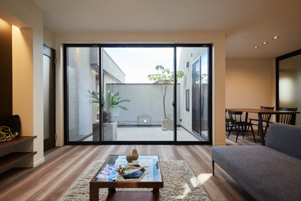 内装はL型のLDKがコートヤードを囲むように配置され、外へと広がる開放感を生み出しています。大きな開口部からは光と風が取り込まれ、室内と屋外がひとつながりになったような、伸びやかで心地よい空間を実現しました。