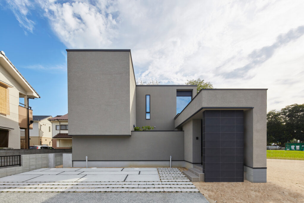 グレー色の塗り壁をベースに、凹凸のあるデザインで奥行きを演出した外観が特徴です。左右非対称のフォルムが視覚的な変化を生み出し、重厚感の中に独自の個性を感じさせます。アプローチから玄関へと長く伸びた動線が、印象的な佇まいを完成させています。