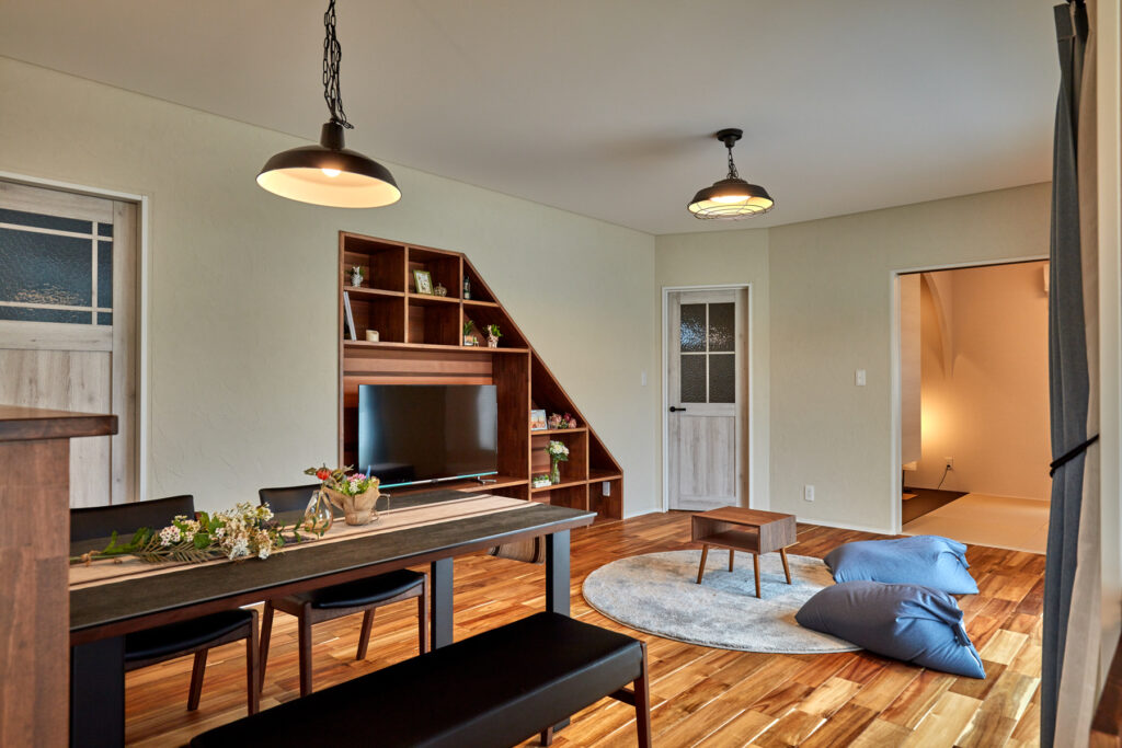 大きな窓から柔らかな光が差し込むリビングは、一日を通して明るい雰囲気に包まれています。ダイニングとひと続きになった空間は、家族が自然に集まる場所です。階段を中心に整理された間取りは、それぞれの居場所を生み出しながら、視線の抜けを大切にしています。