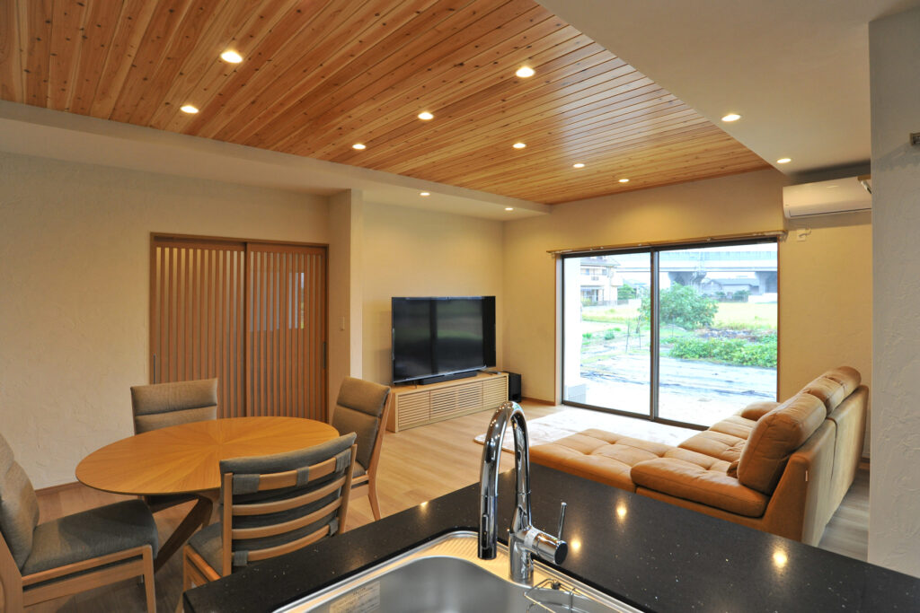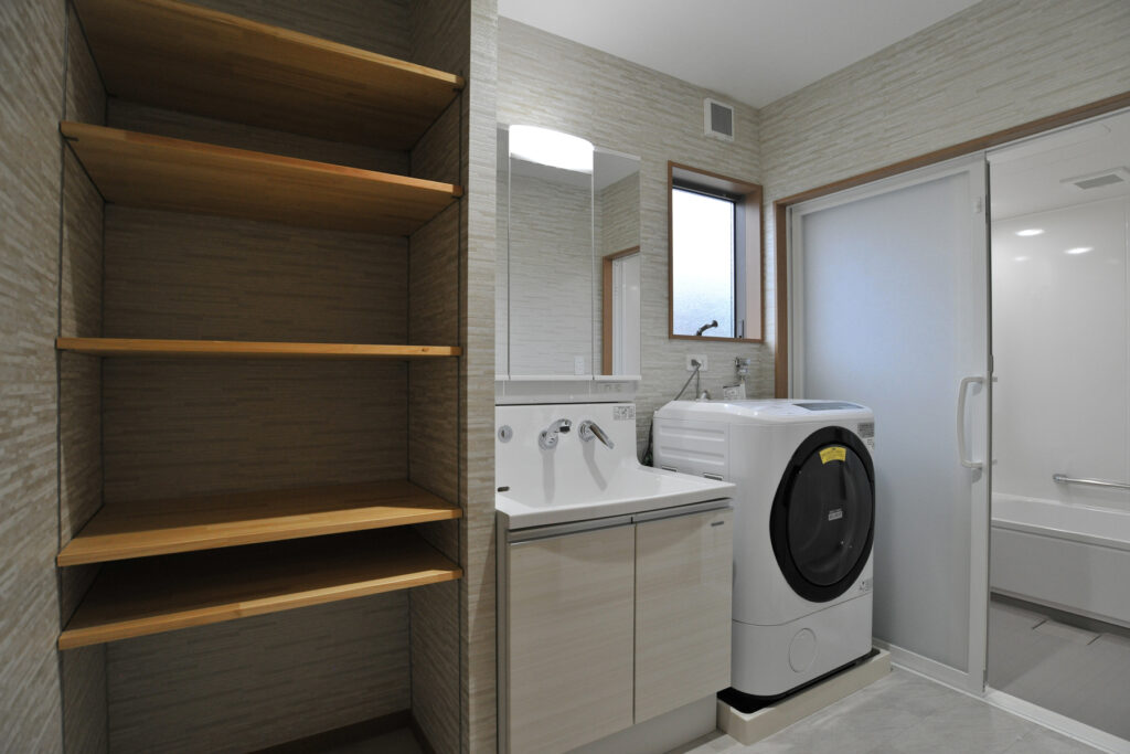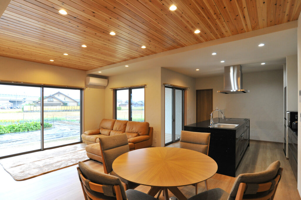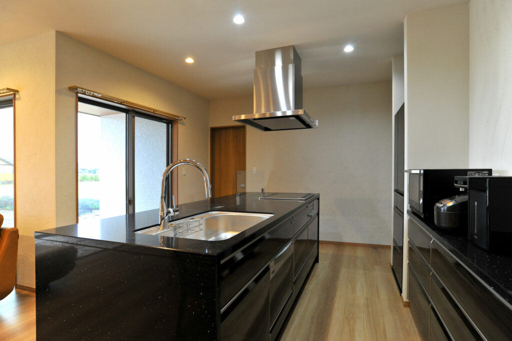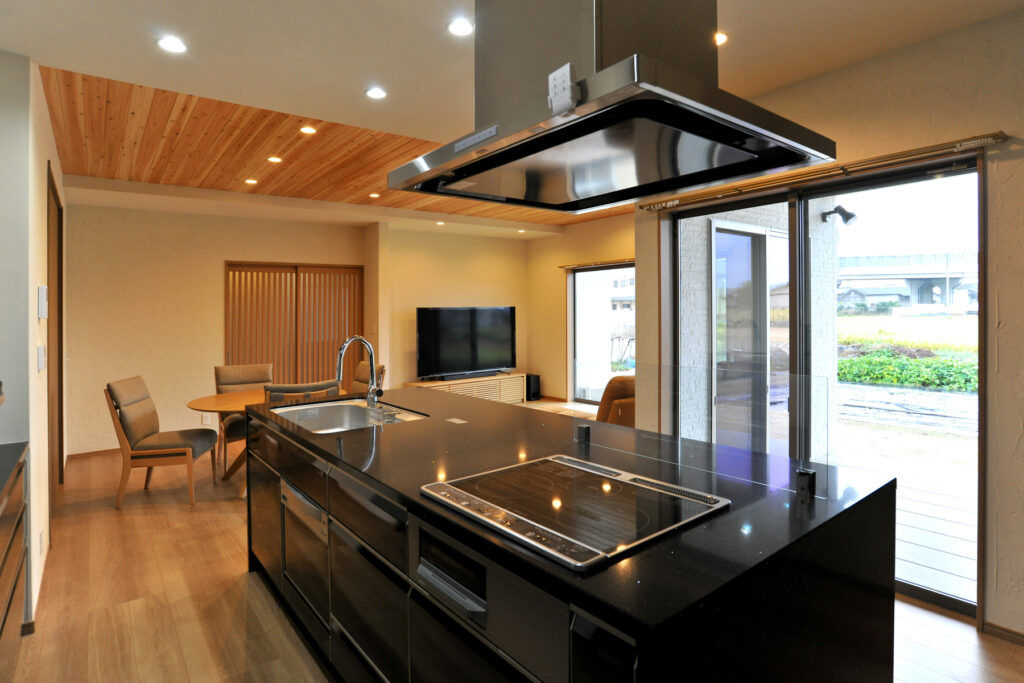 ご主人がイメージした機能性を形にするため、キッチンの背面側にトイレ、洗面、浴室を配置。移動距離を短くすることで、家事の負担を軽減しました。奥さまが選んだおしゃれなアイランド型のキッチンは、料理をしながら家族との会話を楽しめる場所。使い勝手の良さと、心地よさが両立した空間です。