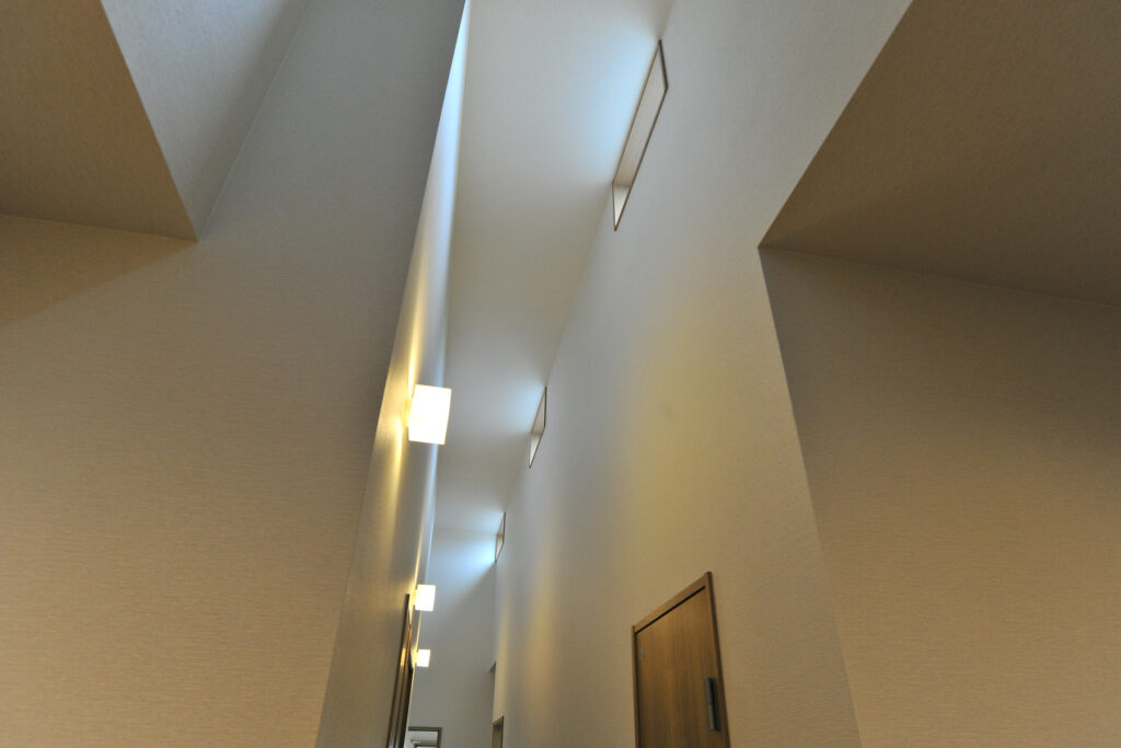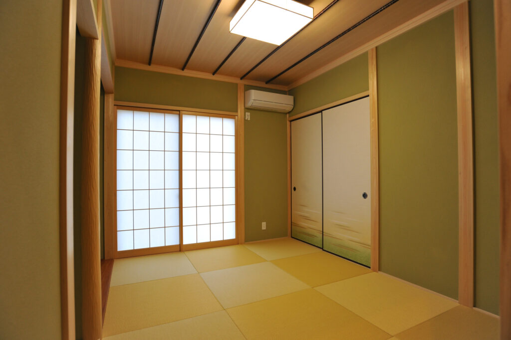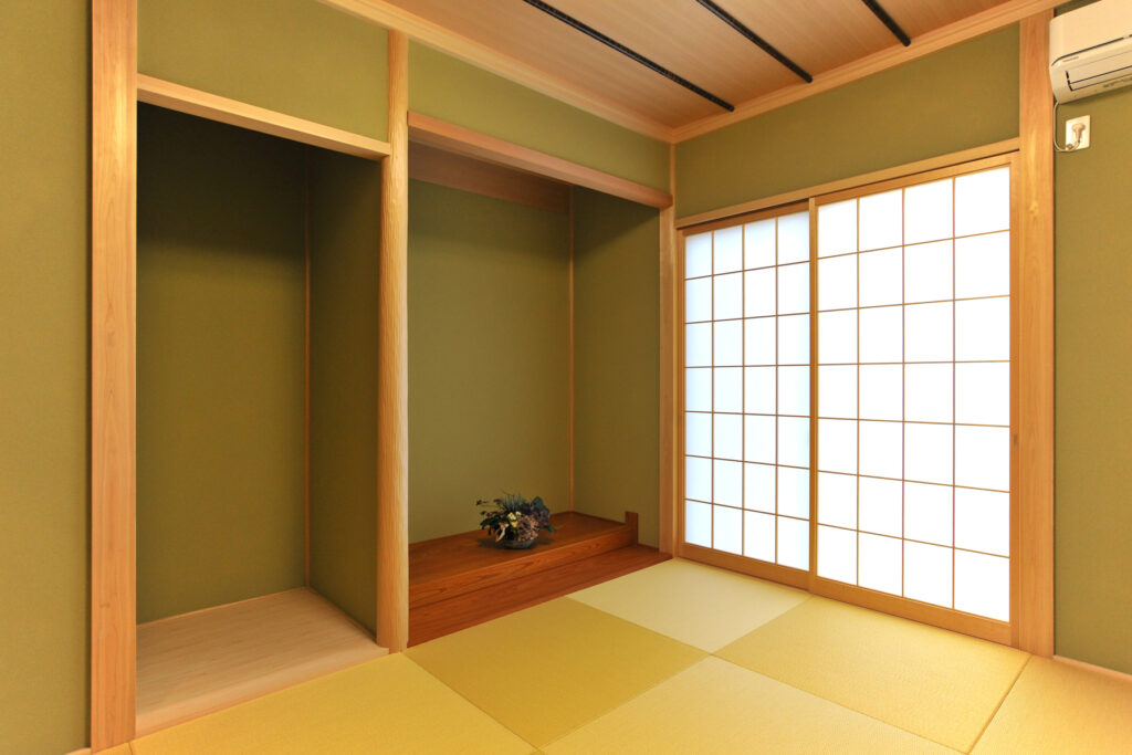 和室への入口には、空間に調和する扉を設えました。廊下に設けた開口部からは、柔らかな光が差し込み、一日を通して明るい雰囲気に包まれます。外観も建物と調和するデザインで、統一感のある佇まいを実現。細部にまでこだわりが行き届いた、個性豊かな住まいが、家族の暮らしを豊かに彩ります。