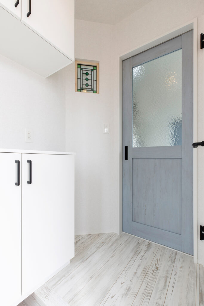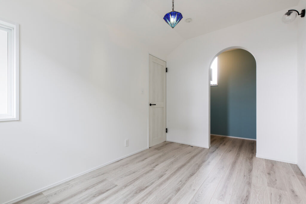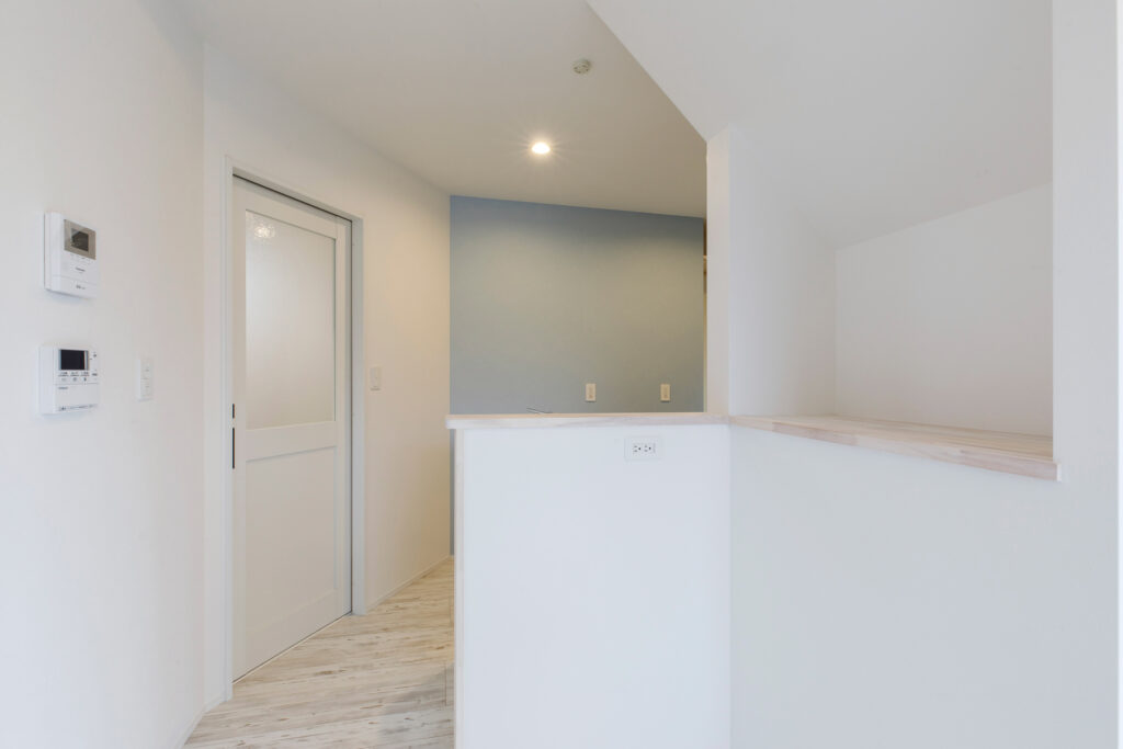 スイッチ周りのニッチや、親世帯に取り入れたステンドグラスなど、何気ない場所にも美意識が息づいています。毎日触れるものだからこそ、見た目の美しさと使い勝手の良さを両立させました。ブルーグリーンの壁が優しく彩る部屋は、静かな時間を過ごすのにぴったりの場所です。二世帯それぞれの日常が、心地よく紡がれていきます。