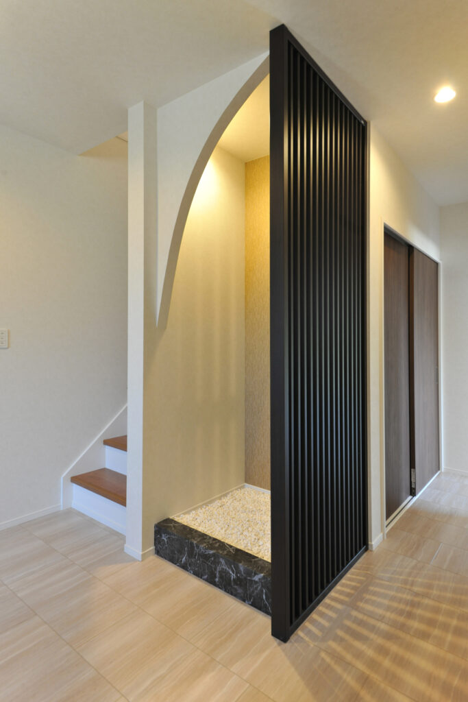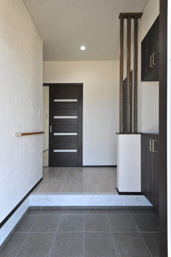 親世帯と子世帯が程よい距離感で暮らせる二世帯住宅を選んだAさんご家族。それぞれのプライバシーを守りながらも、いつでも顔を合わせられる安心感を大切にしました。玄関を入ると、家族を迎えるあたたかな雰囲気が広がり、訪れる人を優しく包み込みます。世代を超えて受け継がれる暮らしの形が、ここにあります。