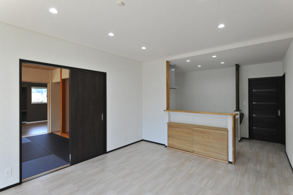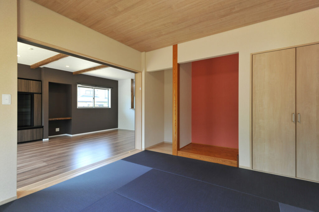 リビングに隣接する和室は、この住まいの象徴的な場所です。深い藍色が目を引く畳は、伝統的な和の美しさに現代的な感性を重ねた選択でした。客間としても、家族がくつろぐ場所としても使える多目的な空間は、日本の住文化を今に伝えます。落ち着いた色合いが心を鎮め、ゆったりとした時間が流れていきます。