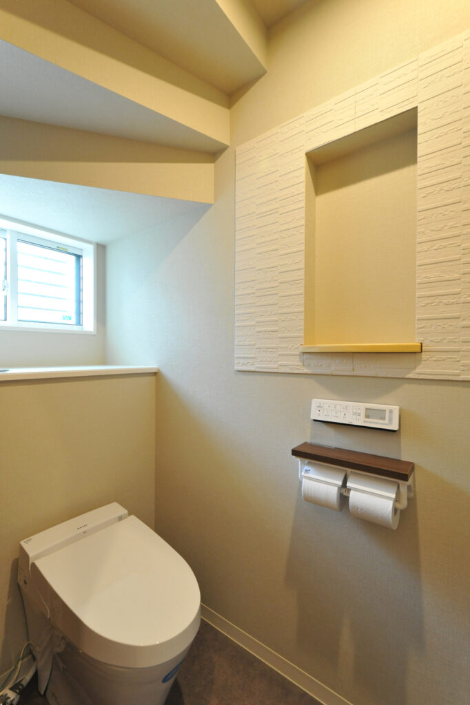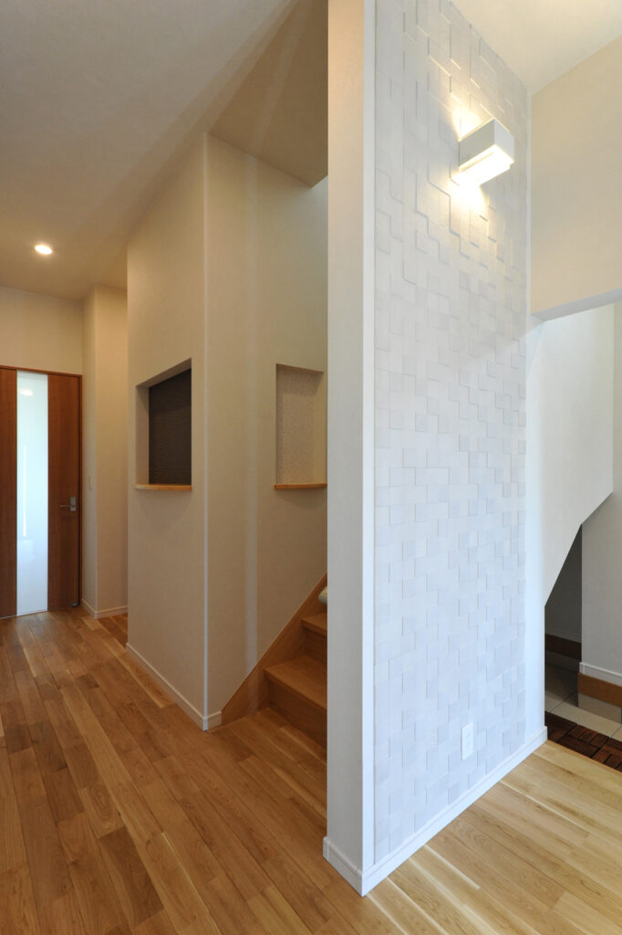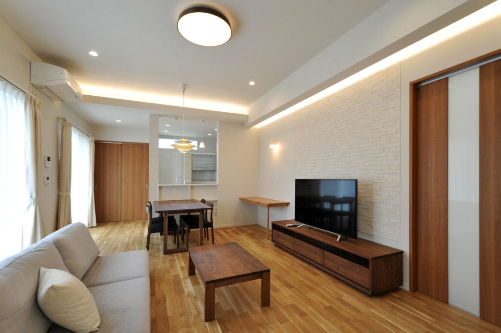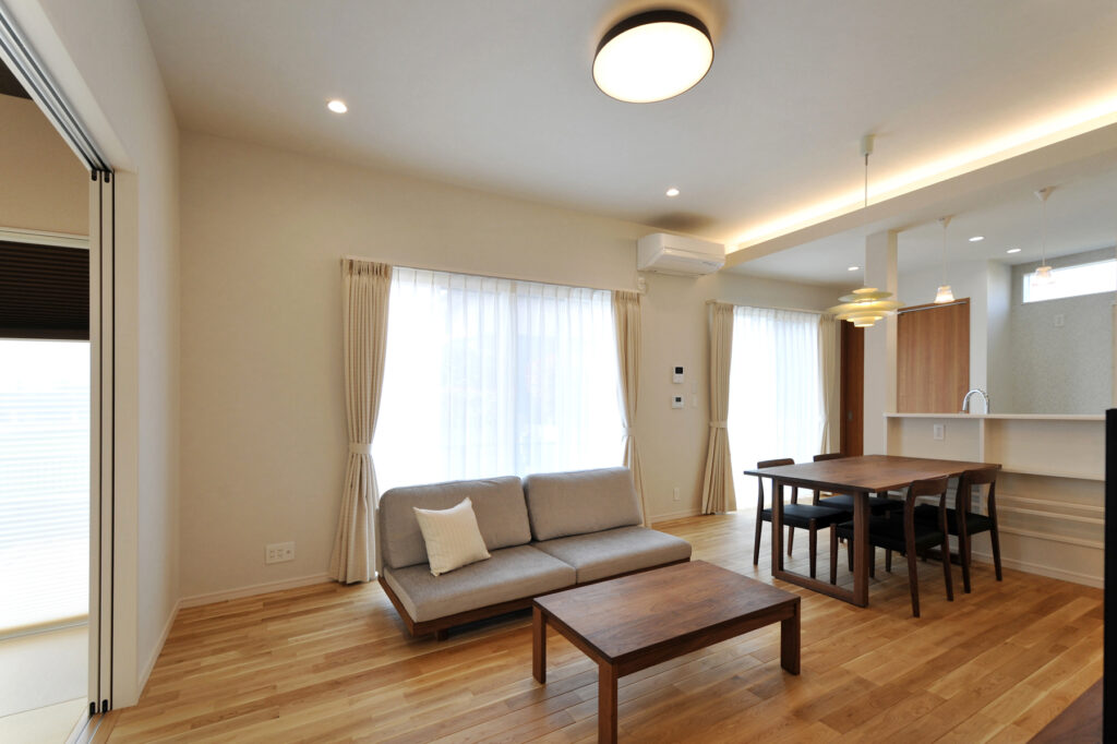 Sさんご家族が選んだのは、縦の広がりを大切にした設計です。リビングに足を踏み入れると、視線が自然と上へと導かれ、ゆとりある空間が広がります。窓から差し込む自然光が室内を明るく照らし、家族が集まるひとときを穏やかに彩ります。伸びやかな空間のなかで、日々の会話が弾み、笑顔が生まれる住まいです。