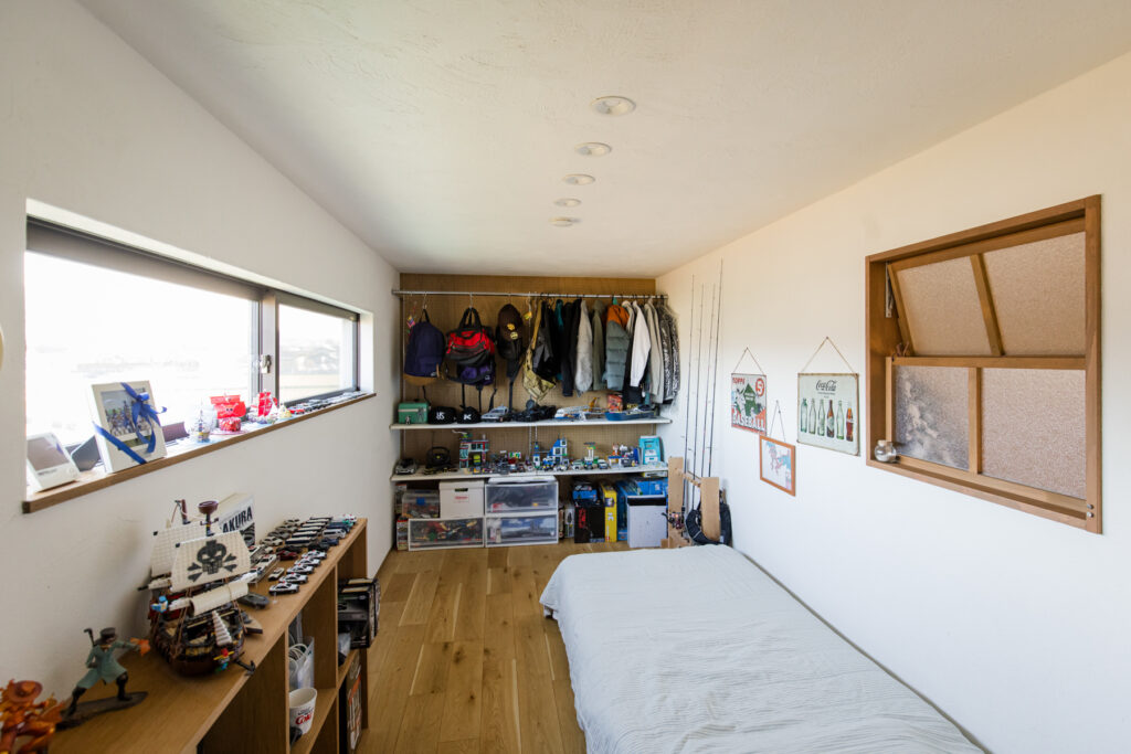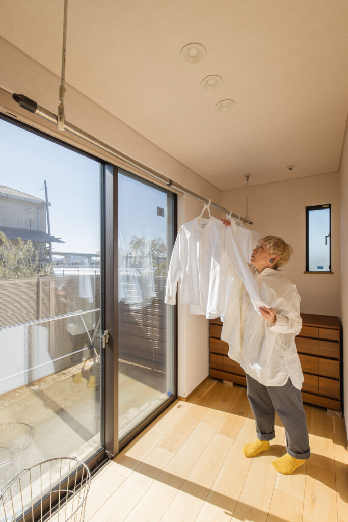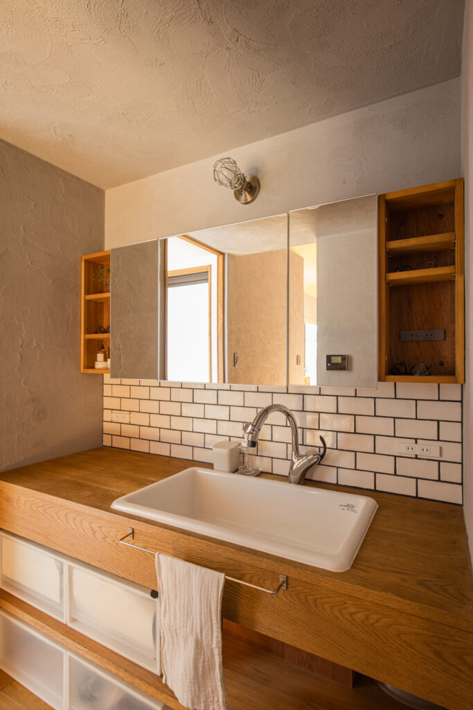 プライベートを守る形で設計された中庭とウッドデッキは、家族が光と風を感じながら過ごせる特別な場所。大きな窓から望む庭の緑が、室内に安らぎをもたらし、内と外の境界を曖昧にします。横並びに続く空間構成が、視線の抜けと開放感を生み出し、実際の面積以上の広がりを感じさせてくれます。