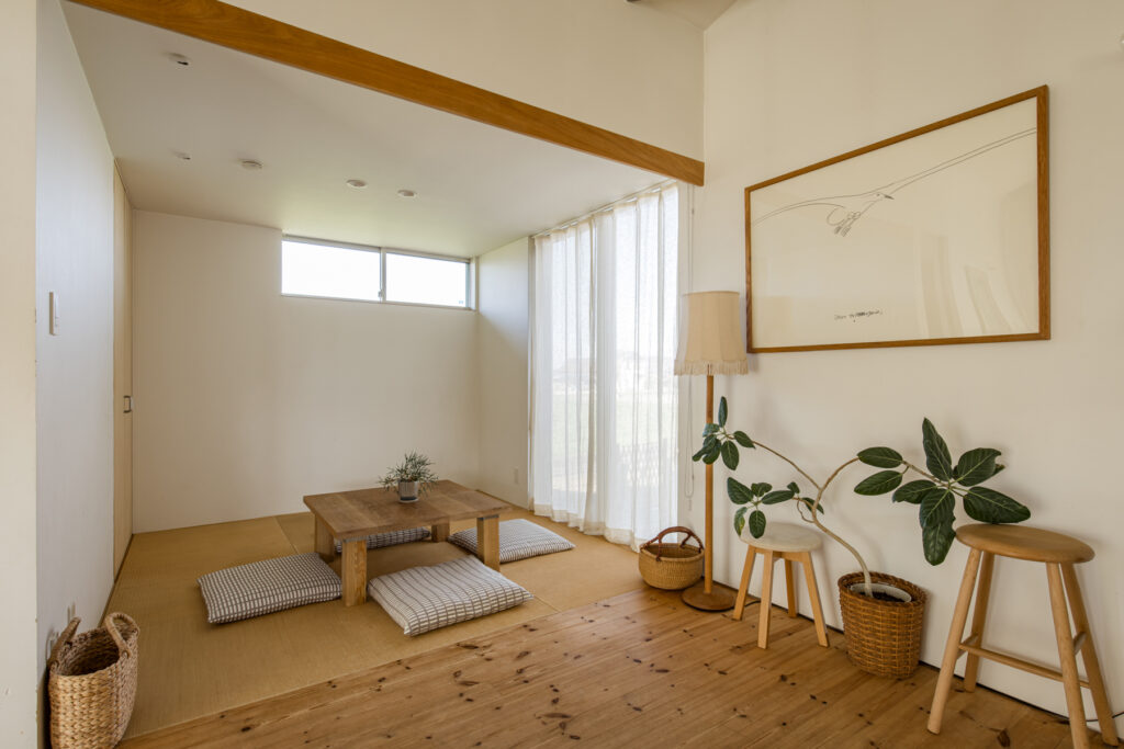 正方形を基調とした間取りは、使い方を固定しない自由さを持っています。2階のロフトからは家族の気配がほどよく届き、絵のように切り取られた窓の向こうには田園の緑が広がります。どこにいても孤独感がなく、自然とも家族とも、ちょうどよい距離感で過ごせる空間が重なり合っています。