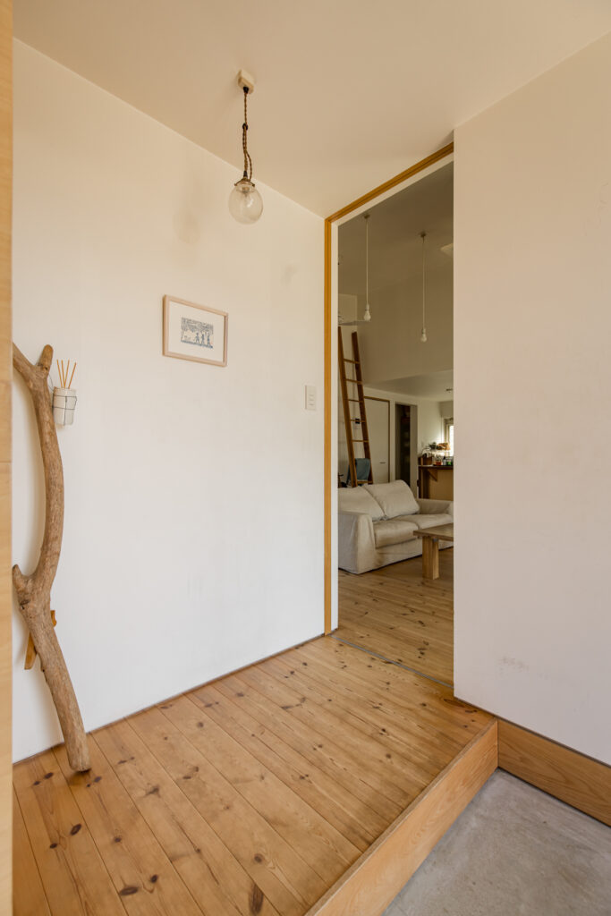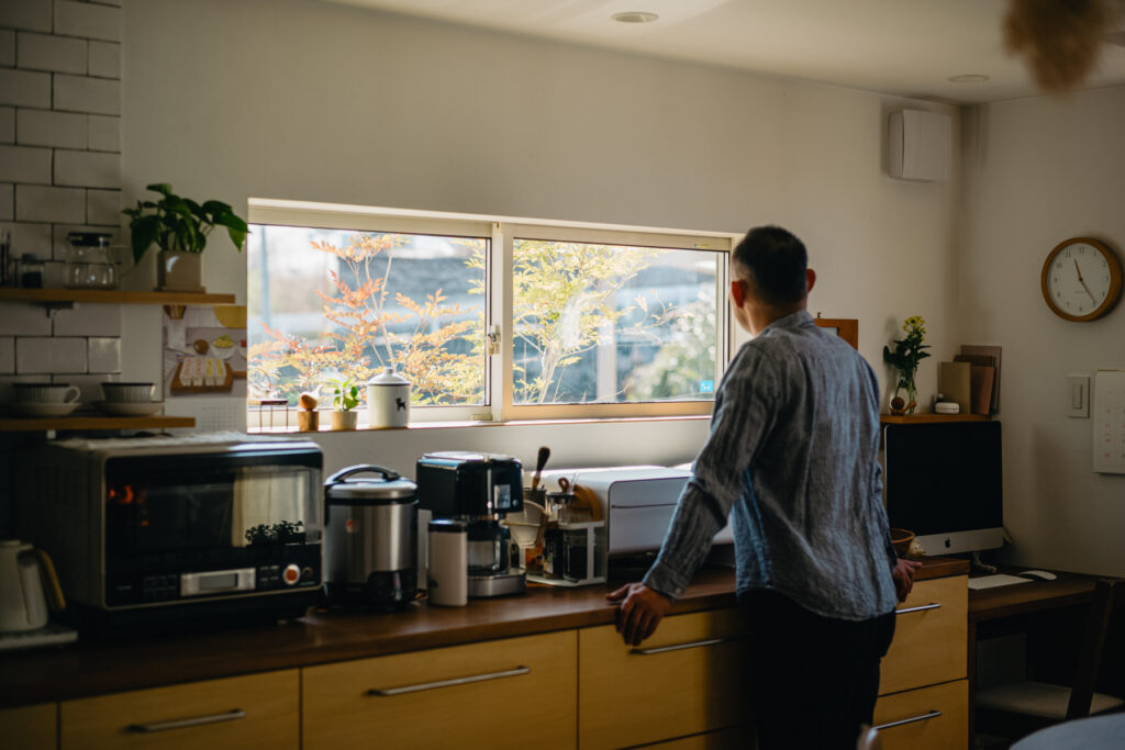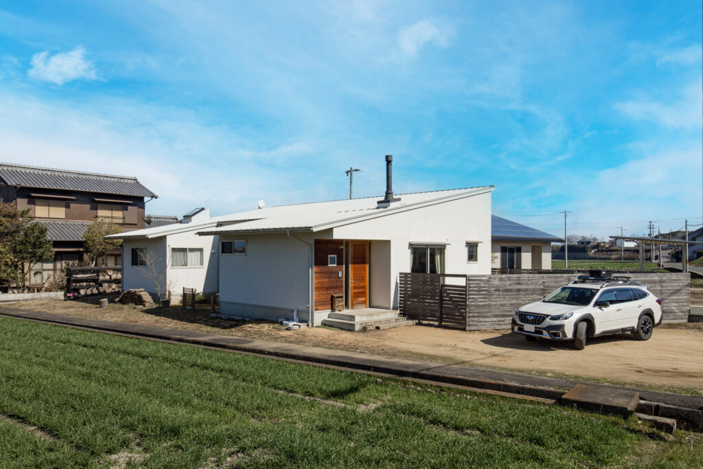 田園の中に立つこの家では、庭の景色が季節ごとに表情を変えます。風の匂いや草の揺れが、日常をそっと豊かにしてくれます。素材一つ一つが時を経るごとに色づき、暮らしとともに家そのものが味わいを深めていきます。