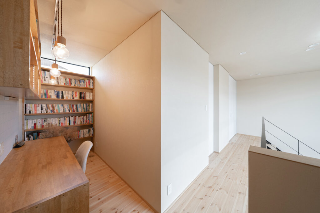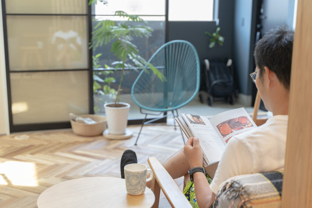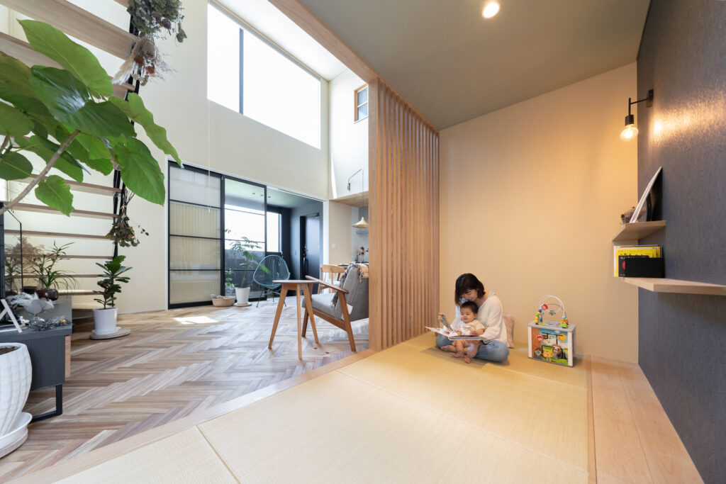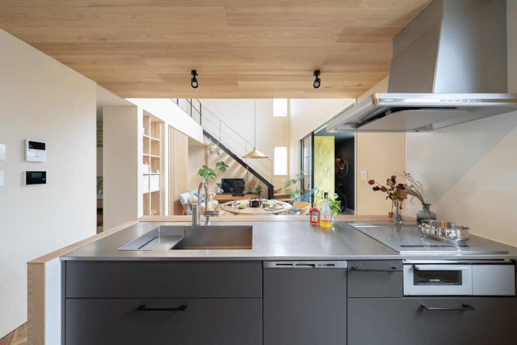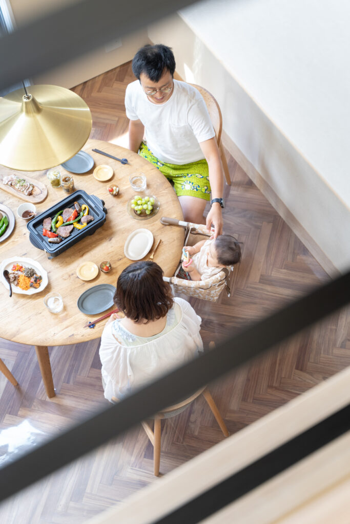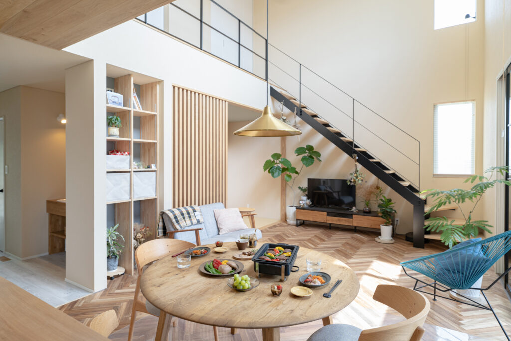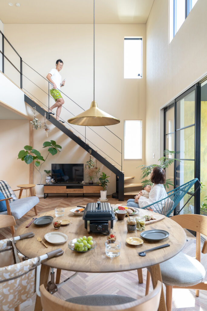 玄関から土間、リビングまで壁や扉をできるだけ省いた、ひと続きの空間になっています。吹き抜けを通じて空を見上げられる設計は、住宅街という立地ながら近隣の視線を気にせず過ごせるのが魅力。実際の面積以上の広がりを感じられ、リビングのソファーに座って空を眺める時間は、家族にとってかけがえのないひとときです。