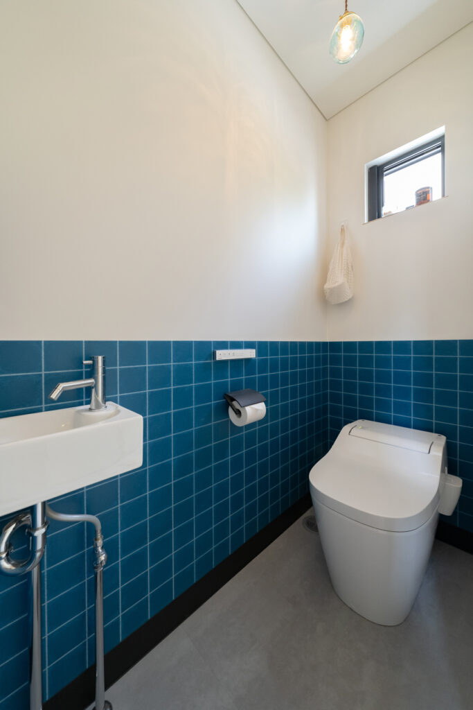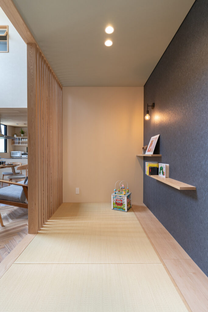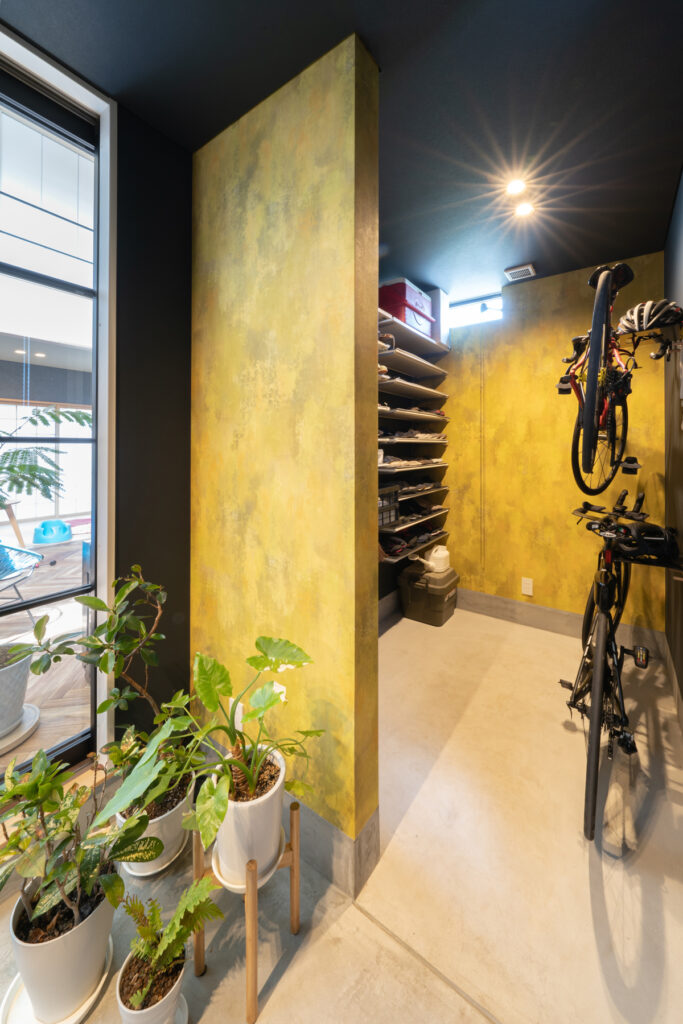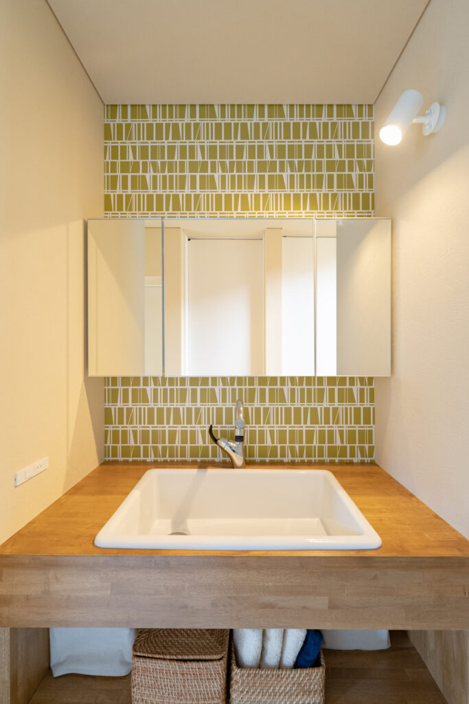 内装デザインには、施主のこだわりが細部まで凝縮。玄関を彩る鮮やかな黄色の壁紙やリビングの床に施された美しいヘリンボーン模様など、視覚から日々を豊かにする工夫がいっぱいです。丁寧に時間をかけて選び抜いた素材や色が、統一感のある洗練された住空間です。
