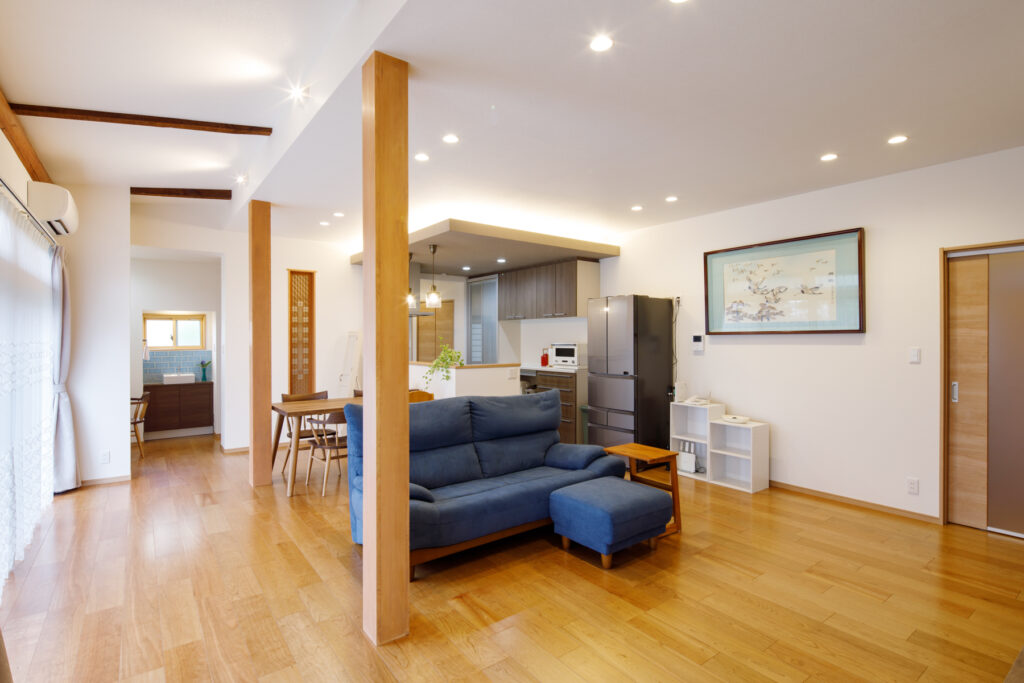 機能性はもちろん、意匠性にもこだわり、TV台の背面にはウォールナットをあしらったり、キッチンダイニングの天井は下がり天井に間接照明を入れて、空間に個性と高級感を演出。「以前の賃貸の住まいとは比べ物にならないくらい快適で満足しています」とほほ笑まれるMさんご家族。生活時間の異なる世帯がお互いに気兼ねすることなく、いつまでも仲睦まじく暮らせる住まいが完成しました。