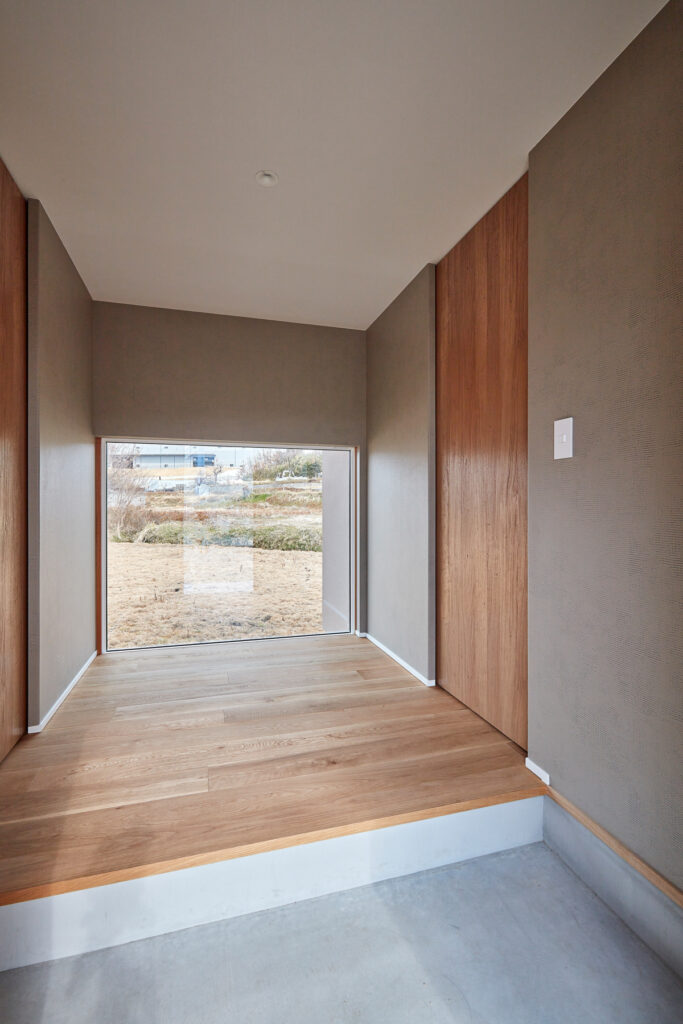 視線が外へと抜ける玄関。左側は水回り、右側はリビングとゾーニングされています。