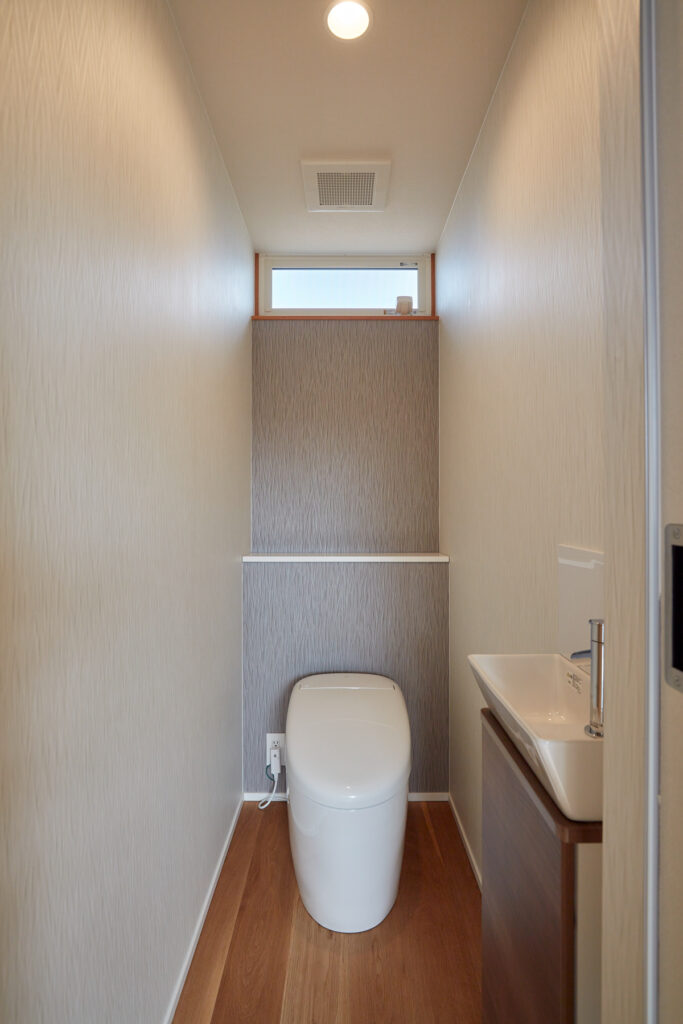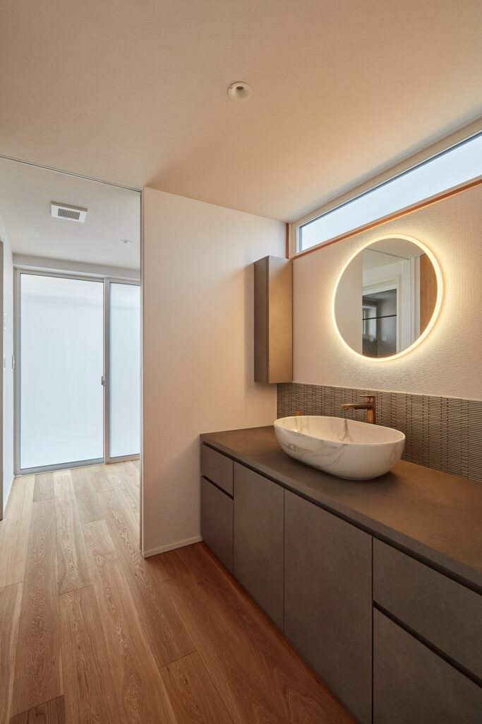 洗面を玄関とランドリーの間の通路に配置した、効率的な生活動線。
