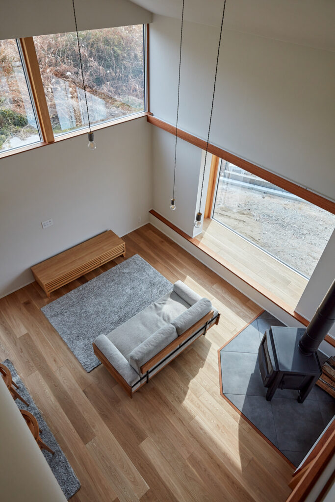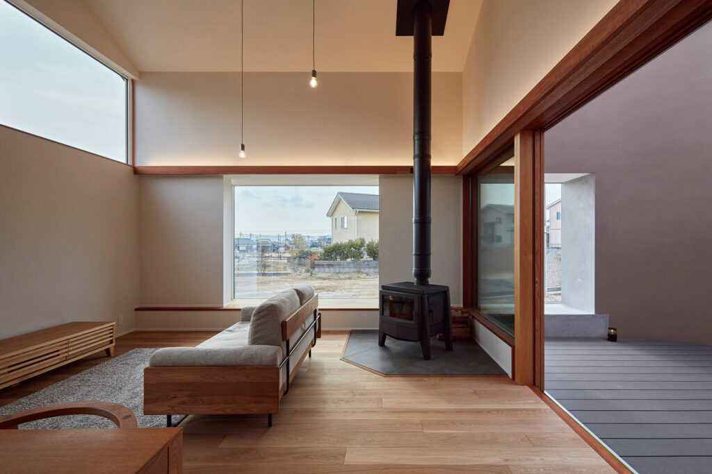 薪ストーブのある大空間は、ガラスの造作建具により内外が一体となった開放的な雰囲気を演出しています。