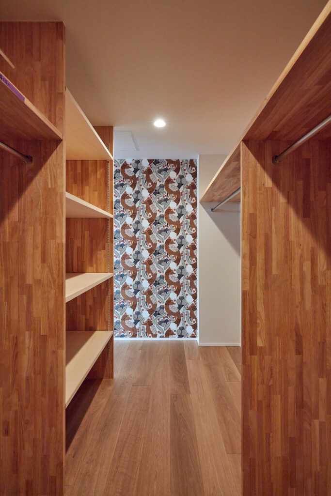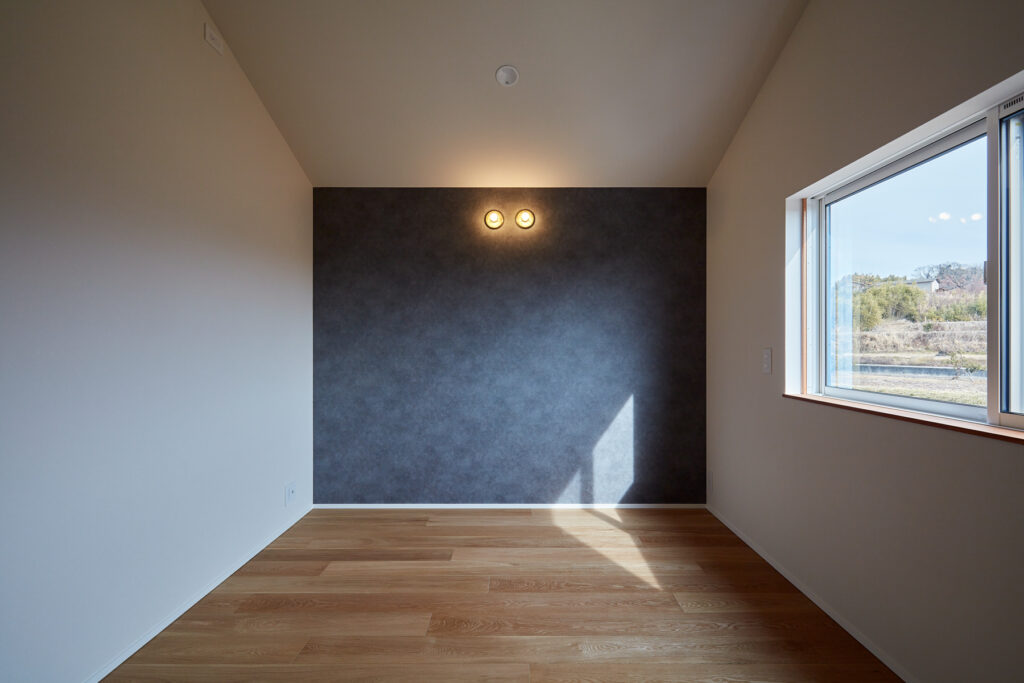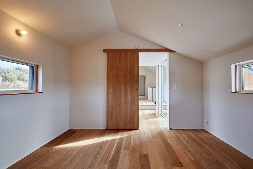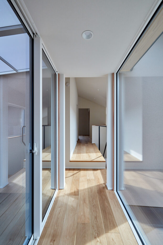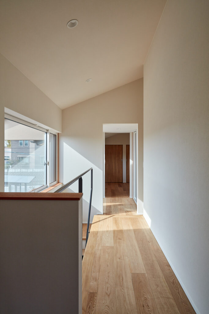 2階中央に設けられた渡り廊下は、ベランダのような役割を果たします。大きな窓からの採光で2階全体が明るく照らされ、窓辺に腰掛けて外を眺めるのも癒やしの時間。渡り廊下を挟んで東西に部屋が配置され、家族それぞれの居場所を確保しながらも、緩やかにつながる空間構成が心地よさを生み出しています。