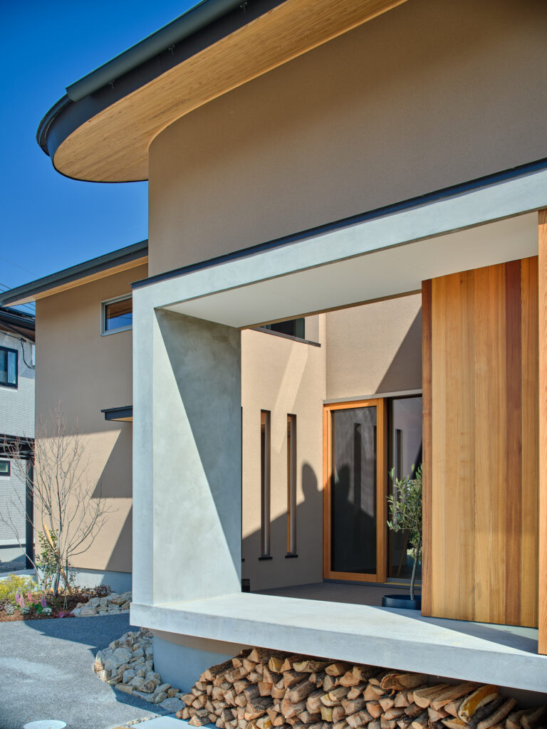 住宅地の中でありながら、目の前には広い空き地、東側には緩やかな段々畑が広がるHさん邸。このロケーションの魅力を存分に生かした設計が特徴です。外からは全く想像がつきませんが、曲線を描く壁の内側には中庭が広がり、伸び伸びとした空間が展開します。中庭のデッキは外部の視線を遮りながらも、見上げれば青空が広がります。