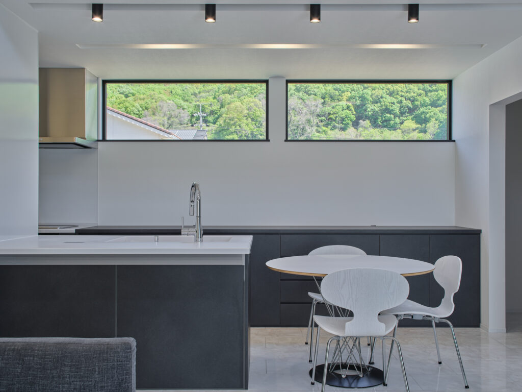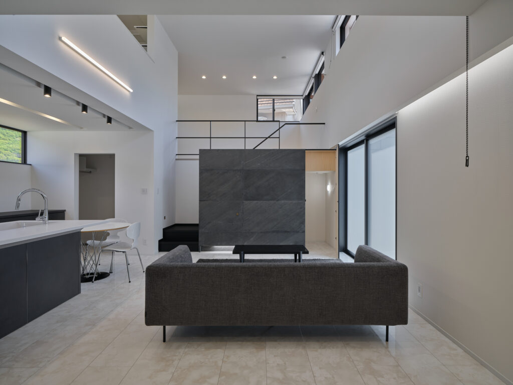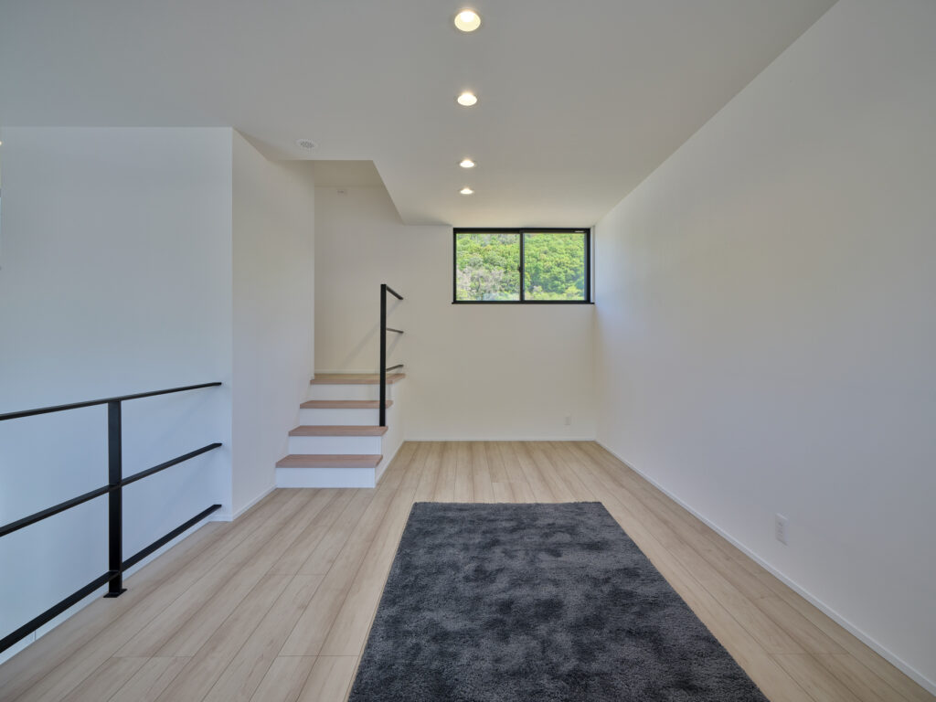 外からの視線を遮る配置ながら、室内は開放的で、緑を望む景色が広がります。スキップフロアを取り入れることで、ゆったりとくつろげるサブリビングも設けました。機能性と美しさを兼ね備えたこだわりの空間が、日々の暮らしを特別なものに変えています。