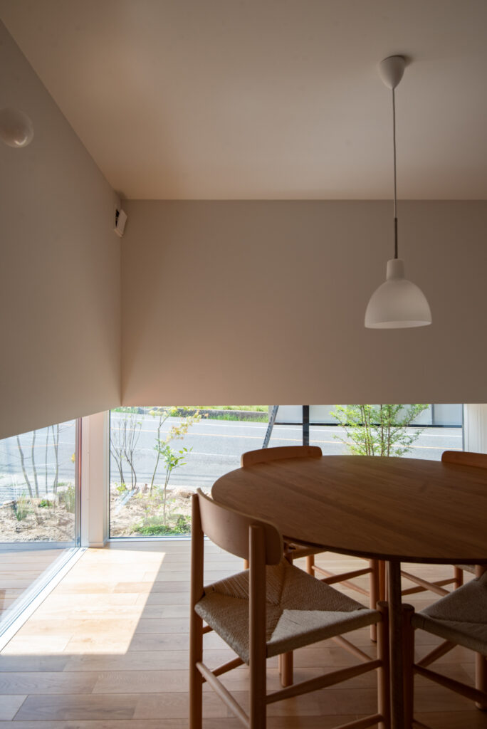 ダイニングには地窓を設け、外の緑をさりげなく取り込む設計。