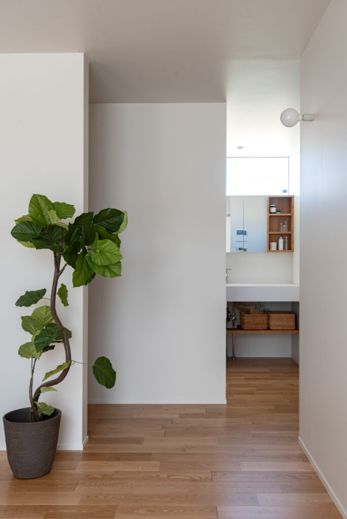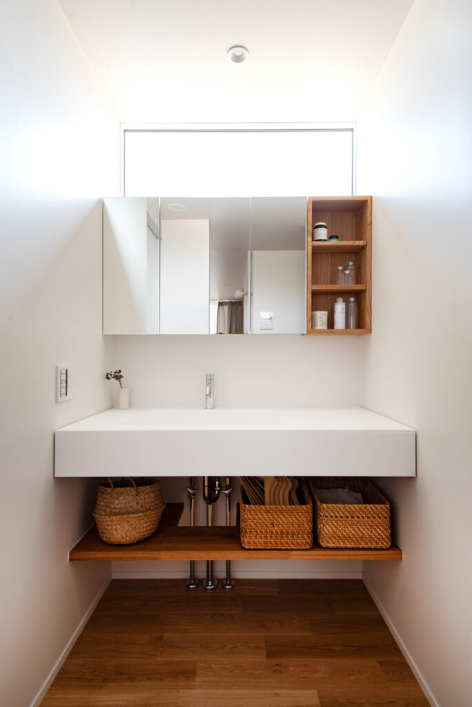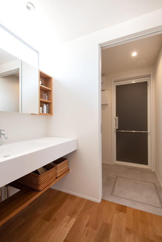 造作洗面台は独立配置で朝の身支度もスムーズに進みます。