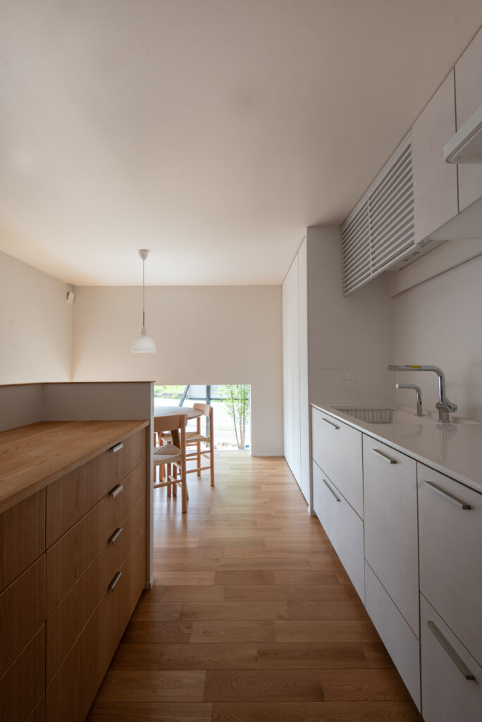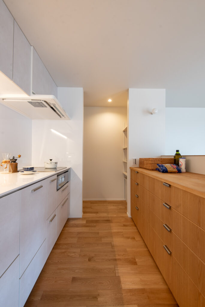 壁付けキッチンと造作カウンターで動線がすっきり整っています。