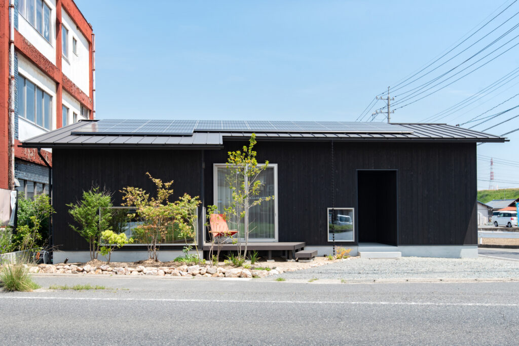 焼杉の外壁と植栽が調和し、個性ある佇まいを演出。