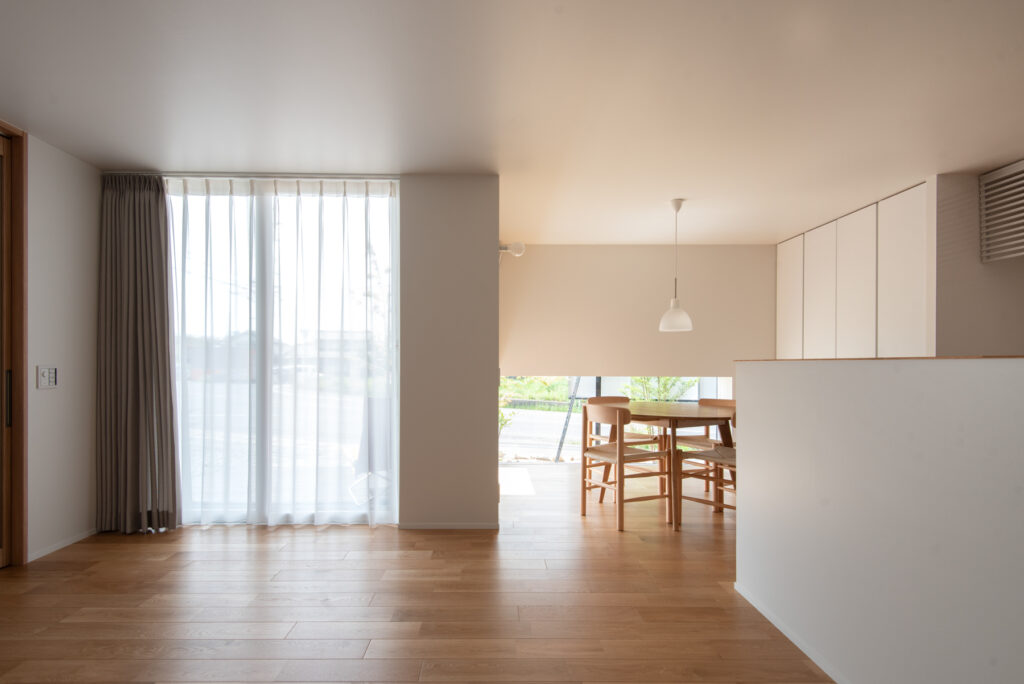 白を基調にしたLDK。光を取り込み昼間は電気をつけなくても十分な明るさを確保。