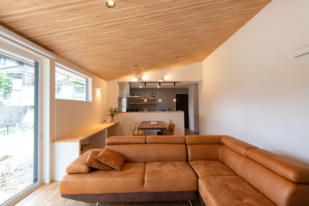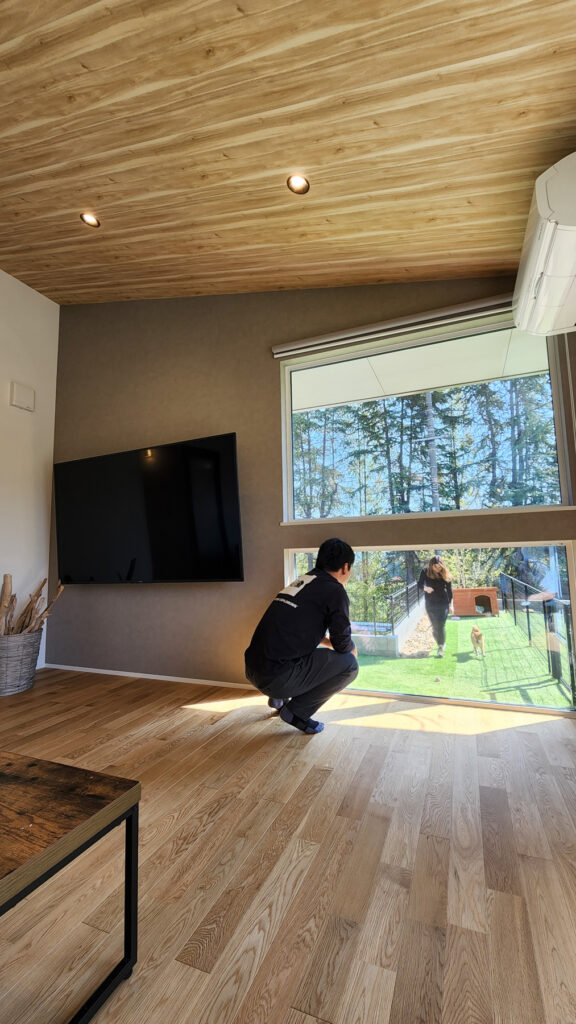 23帖のLDKは勾配天井と大きな窓が特徴。山の緑や庭で遊ぶ愛犬の姿を室内から眺められる設計です。4095mm幅のワイドサッシが、内と外を緩やかに連続させ、自然の移ろいを身近に感じられます。片流れ屋根のラインが印象的な外観と、焼杉とガルバリウムの素材感が調和しています。
