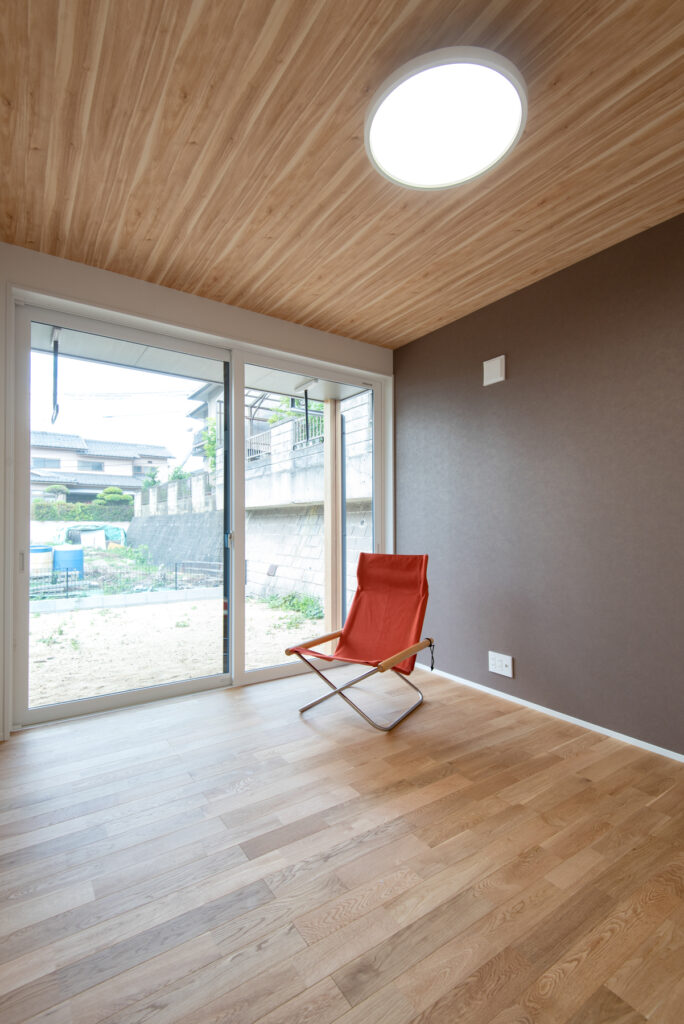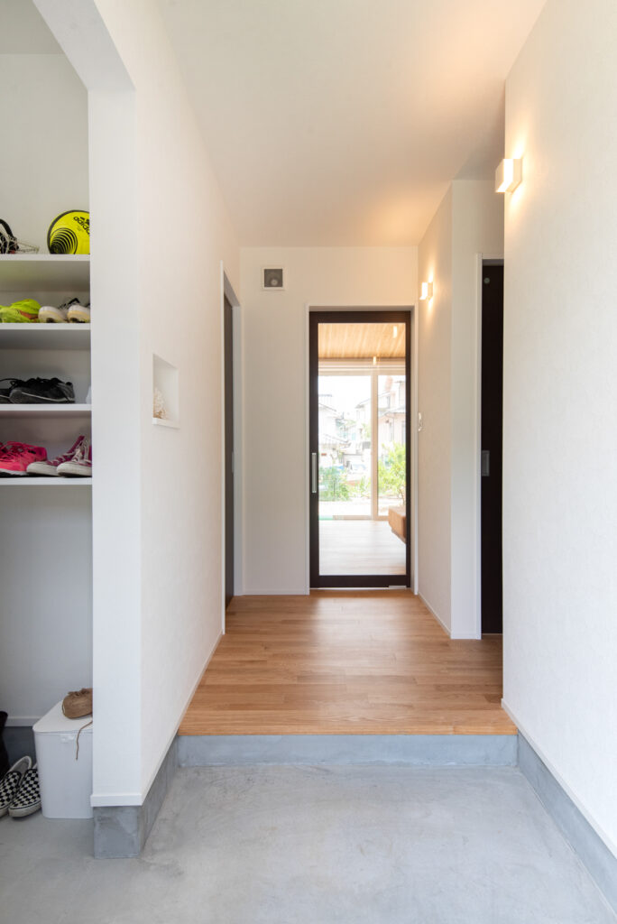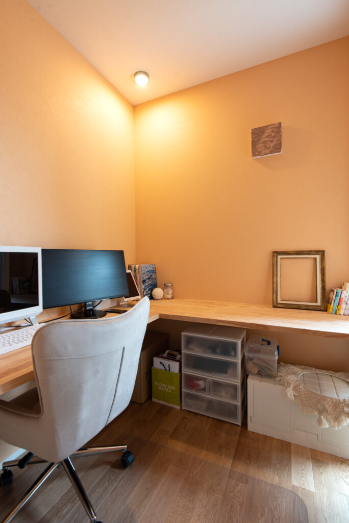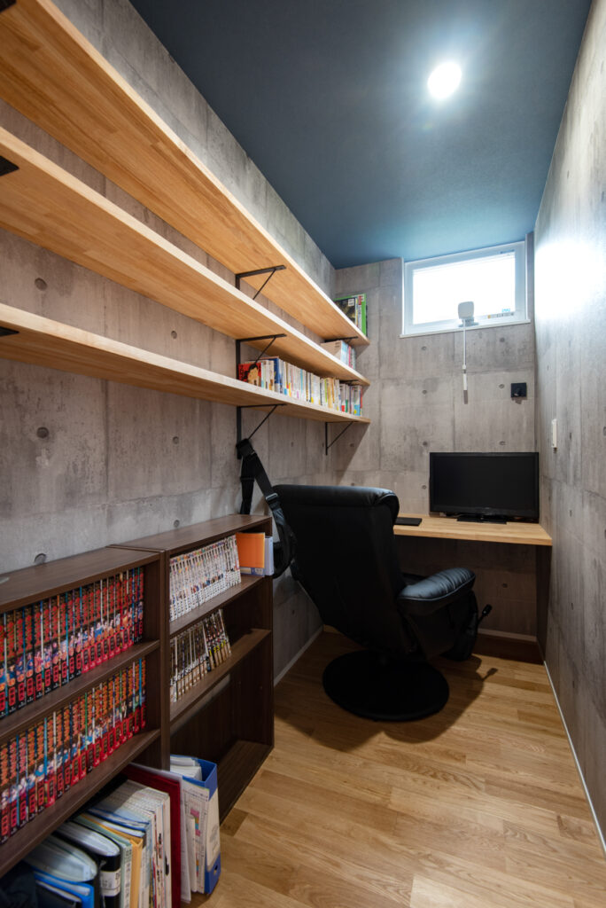 ご主人の書斎はコンクリート調クロスと木棚で落ち着いた雰囲気。奥さま専用の書斎はぬくもりある仕上げです。洋室は将来の家族構成に合わせて間仕切り可能。クリアな建具や土間続きのシューズクロークなど、細部まで暮らしやすさを追求した設計です。