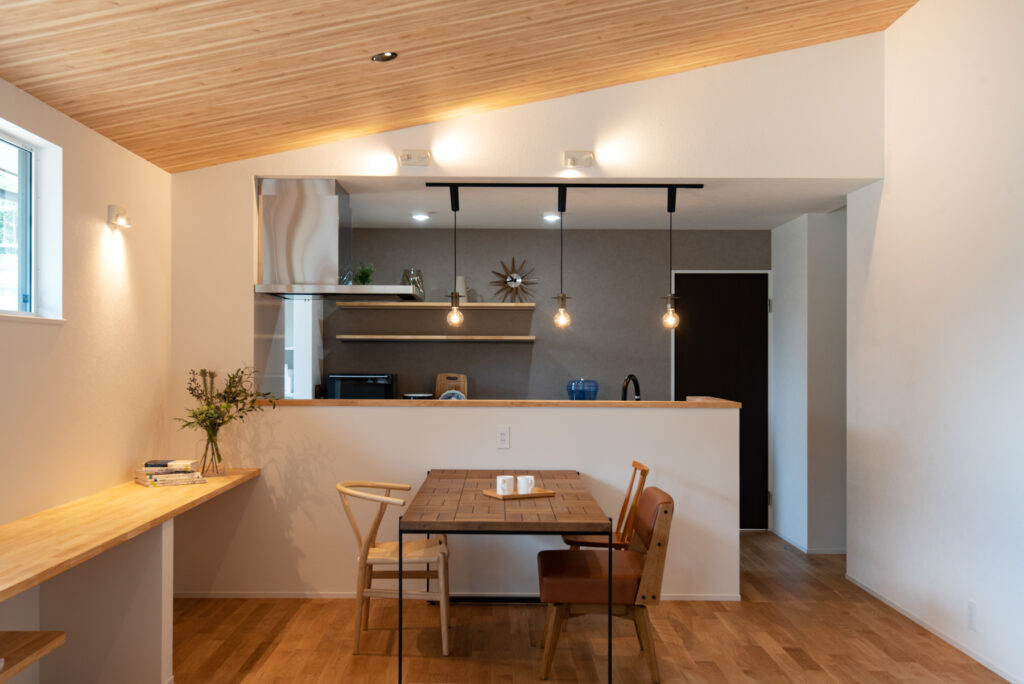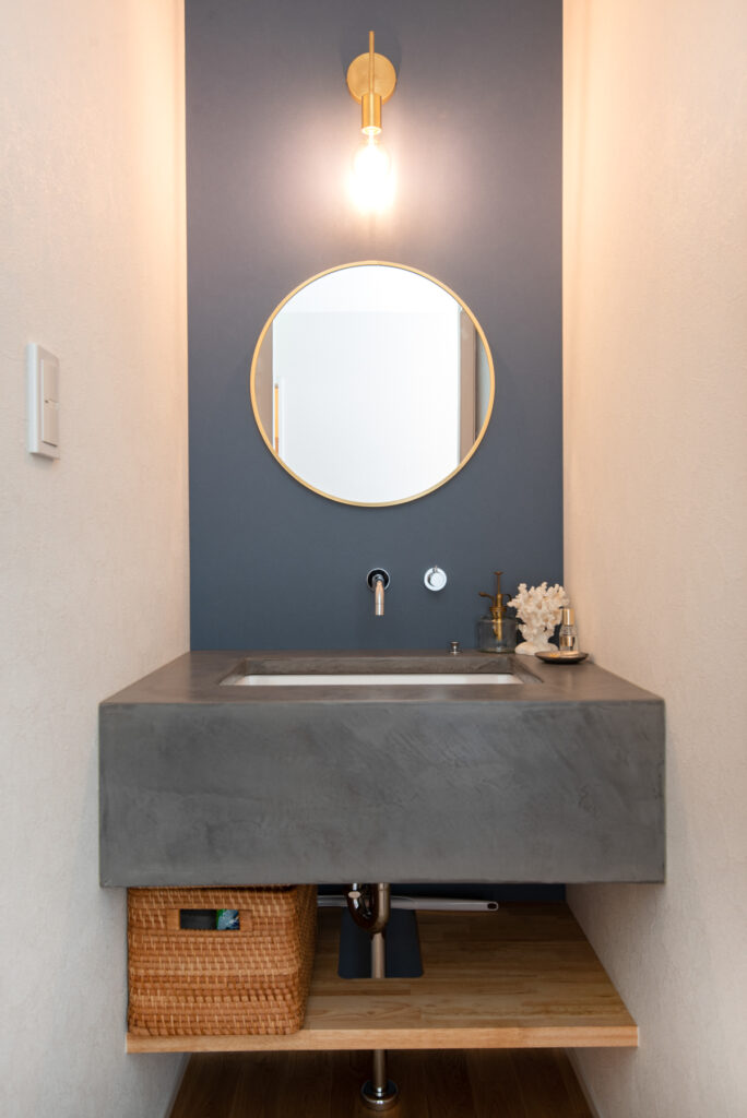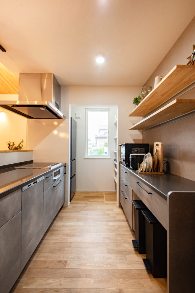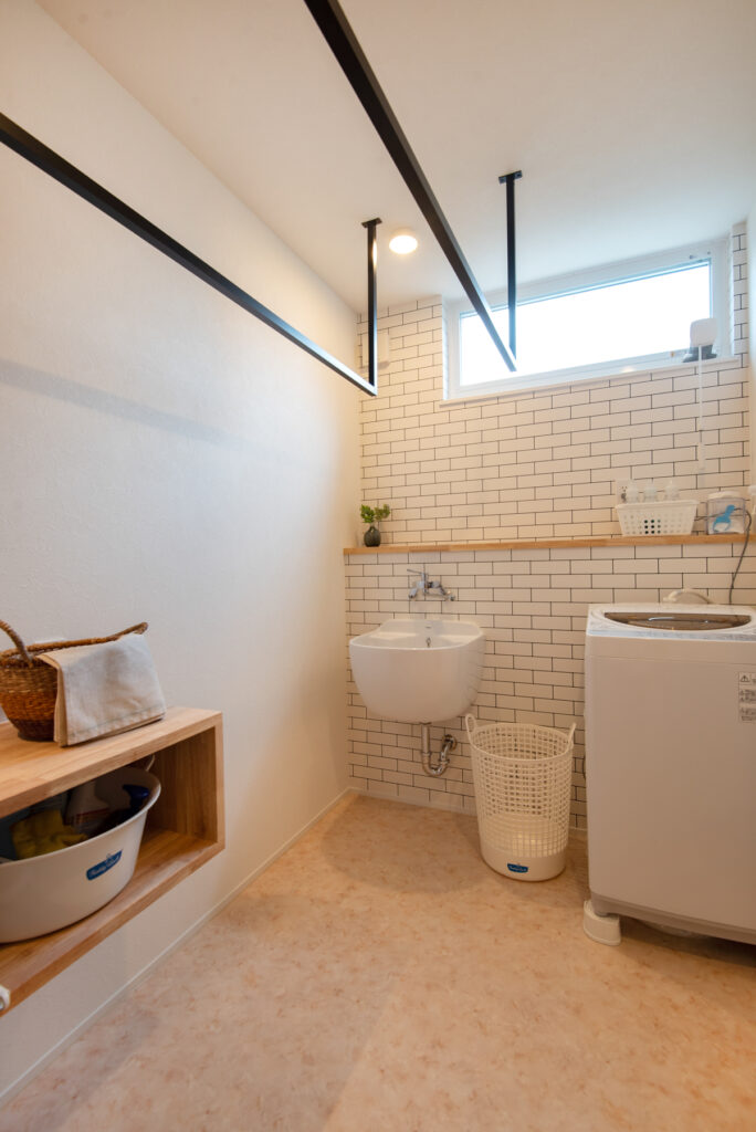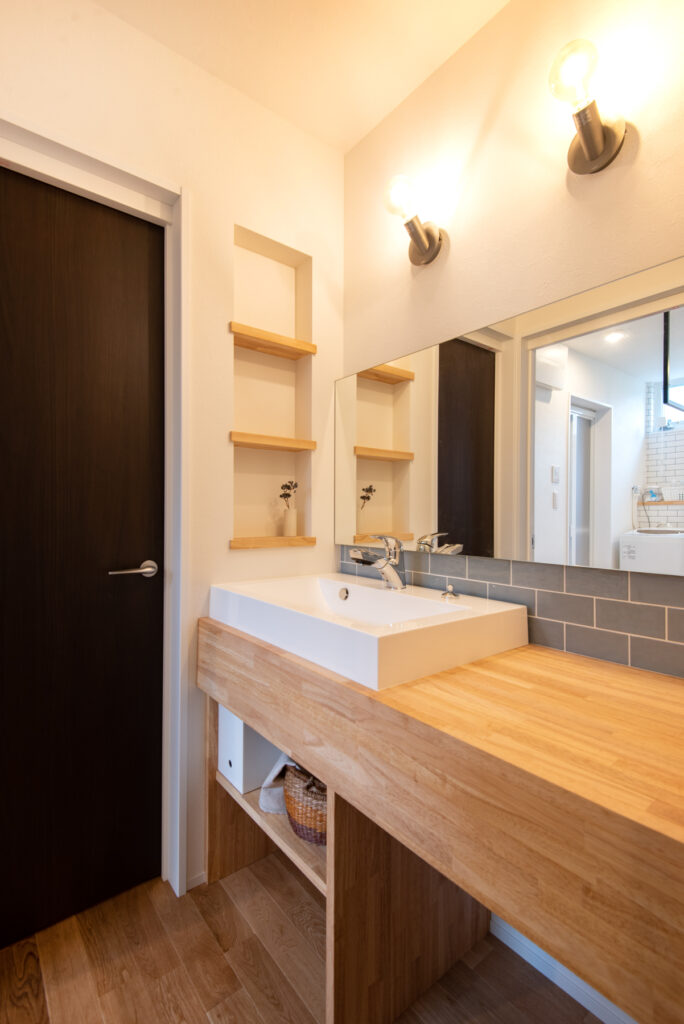 キッチンはグレーカラーで統一し、対面式でダイニングと程よい距離感。ダイニング横のカウンターはワークスペースとしても活躍します。造作洗面台は脱衣室とは分け、独立した位置に配置。玄関横にも手洗い器を配置しました。ランドリーには室内物干しや造作棚を備え、家事効率を高めています。