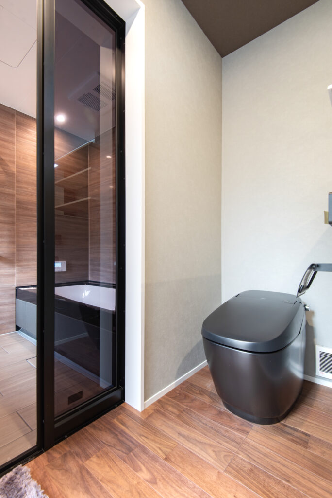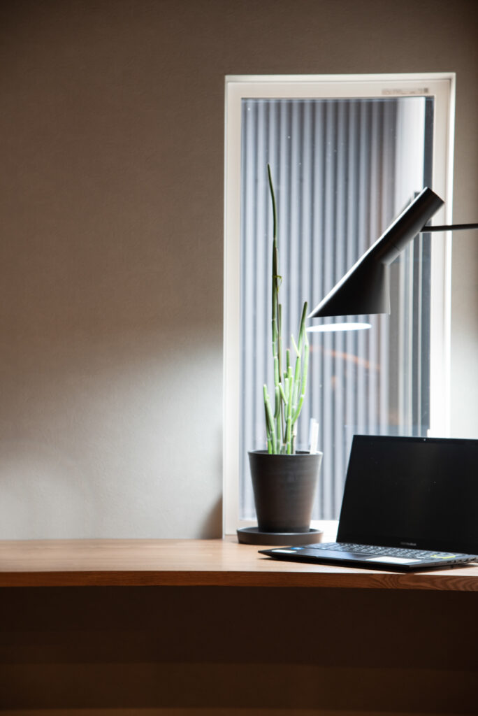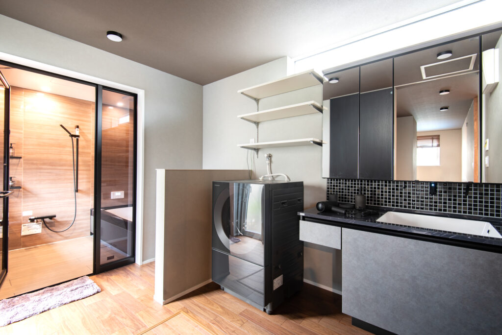 洗面・脱衣・トイレが一体となった水回りは、「LIXIL ルミシス」の洗面台や木目調の浴室など、機能性とデザイン性を両立。ランドリースペースには収納棚を設け、洗濯から片付けまでがスムーズ。窓際のワークスペースは自然光が差し込み、集中とリラックスを両立する設計です。