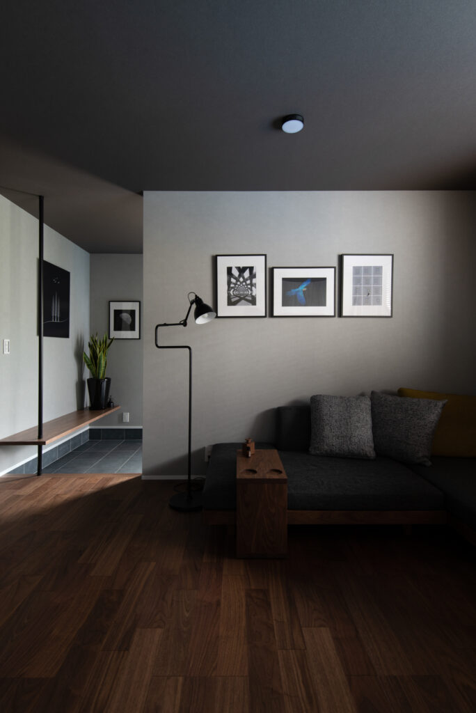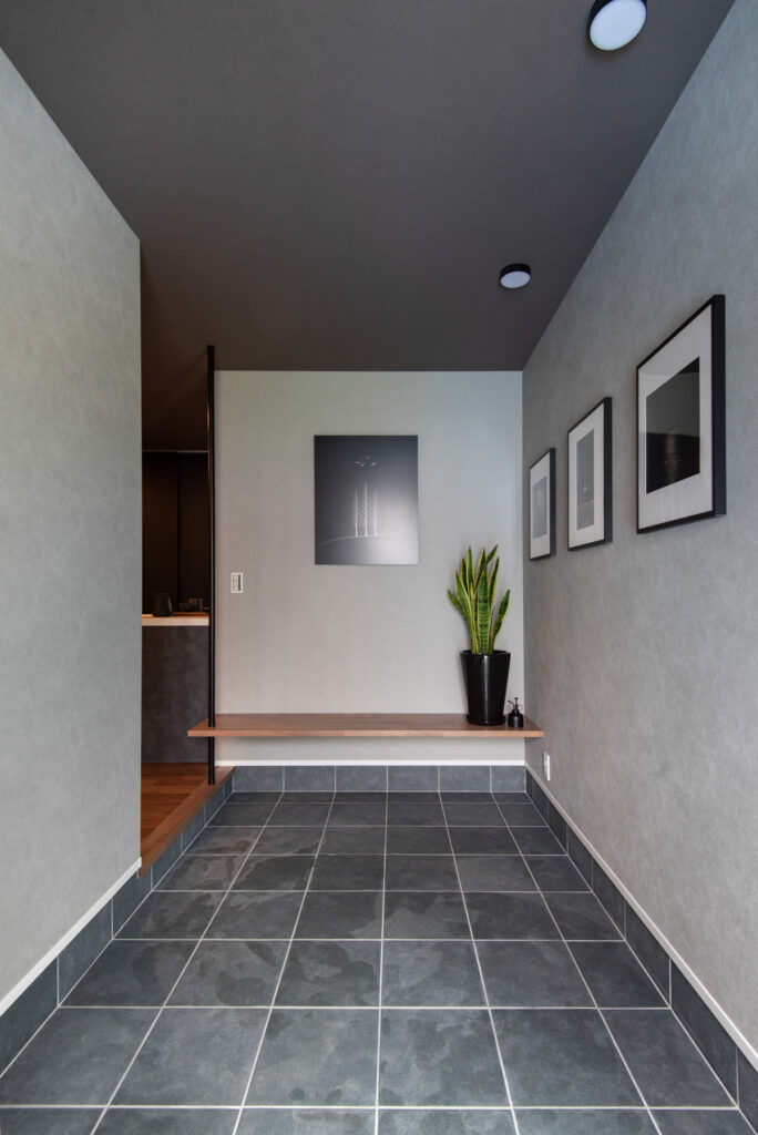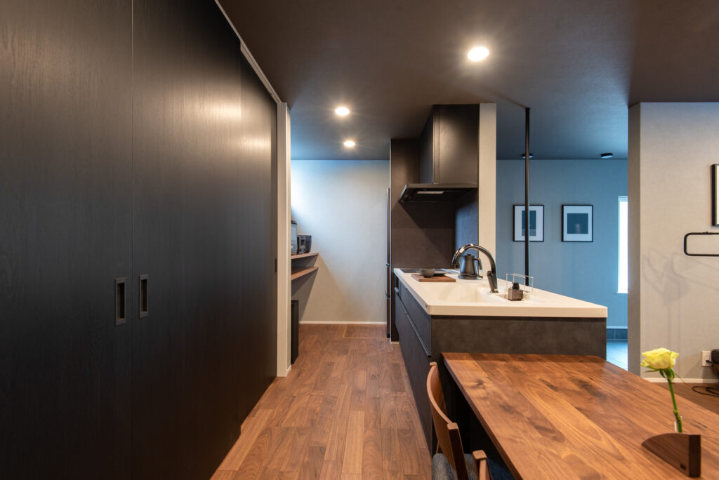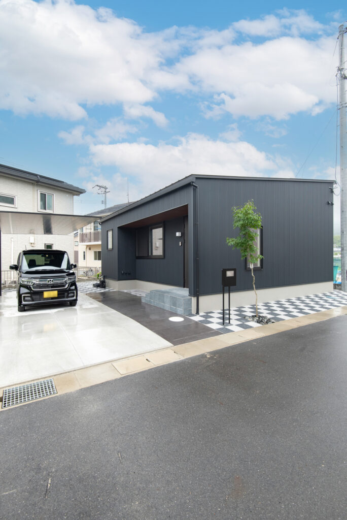 黒を基調とした外観は、分譲地の中でもひときわ目を引く存在感。シンプルなフォルムに市松模様のアプローチを合わせ、静かながらも個性を放ちます。広めの玄関土間はギャラリーや見せる収納としても活用でき、米客時にも印家的。集合住宅では得られない、自由で気兼ねのない一人響らしの理想形がここにあります。
