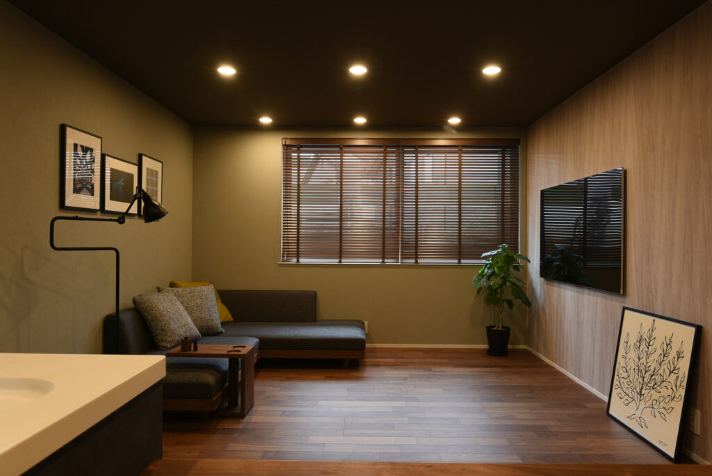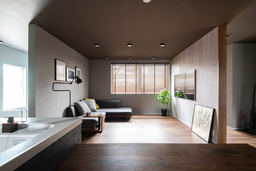 リビングは落ち着いた色調と上質な素材感が織りなす大人の雰囲気。キッチンはモノトーンで統一し、家電類は視界から外れるよう配置。ダイニングはキッチンと一直線に並び、家事効率も向上。アートや間接照明がアクセントとなり、ホテルライクなくつろぎを日常に取り入れています。