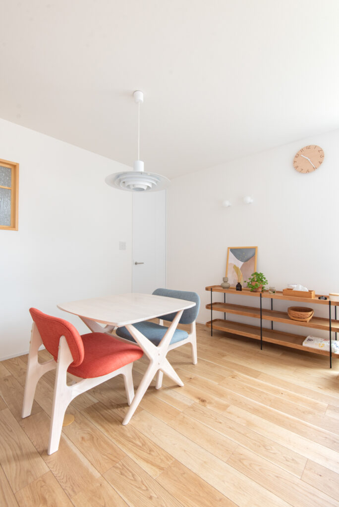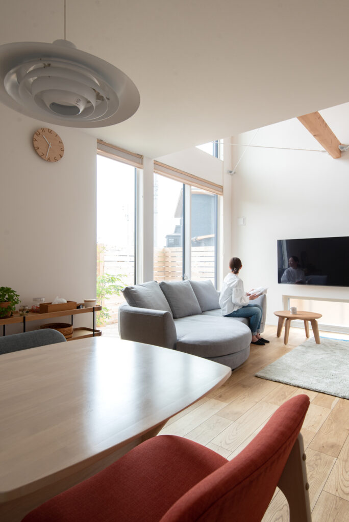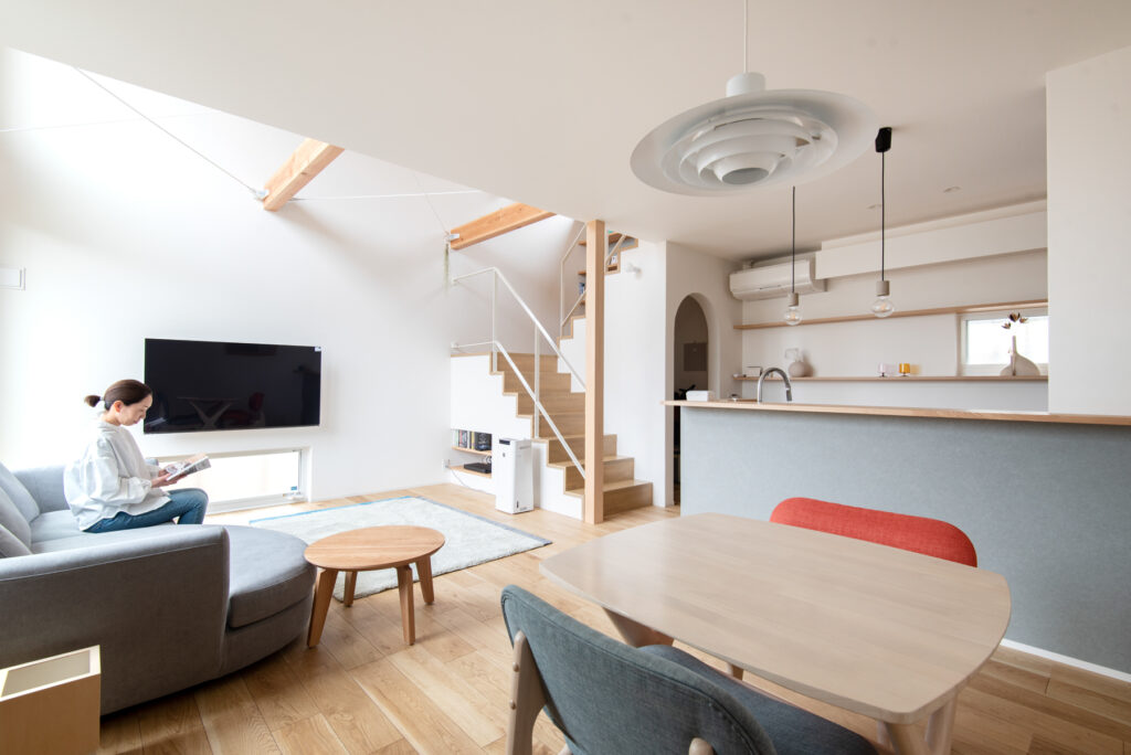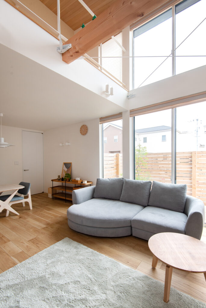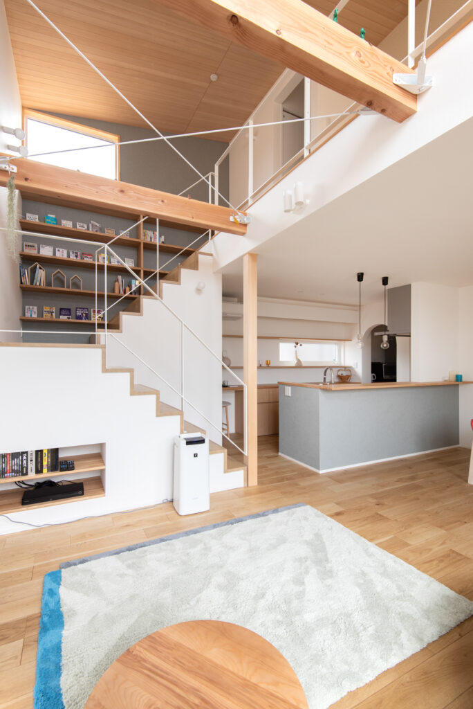 リビングには大きな吹き抜けを設け、上下階のつながりを演出。階段脇の本棚がアクセントとなり、読書好きのご夫婦にびったりの設計です。スチール手すりや現し梁が軽やかさを添え、どごにいても視線が抜ける心地よさを実現しています。階段下の収納や造作棚も活用し、暮らしやすさと遊び心を両立させました。