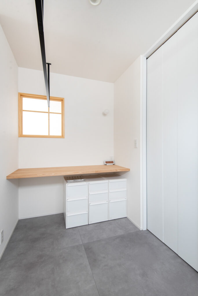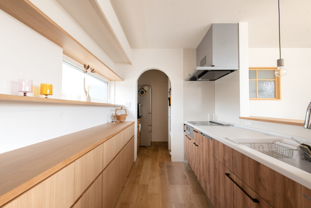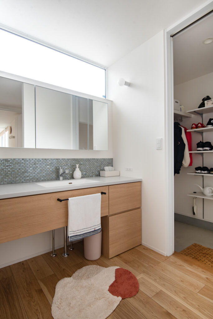 キッチンは対面式で、ダイニング・リビングを見渡せる配置。パントリーを経由してランドリースペースヘとつながる動線が、家事の負担を軽減します。洗面台は幅広設計で、2人並んで使える仕様。帰宅後すぐに手洗いできる動線も魅力です。収納や動線計画により、日々の家事が効率的に進みます。