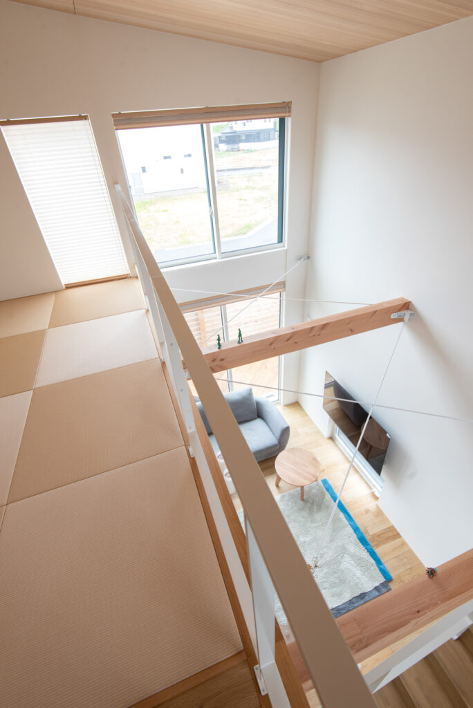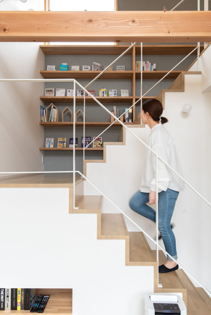 吹き抜けと本棚階段が生む広がりと遊び心