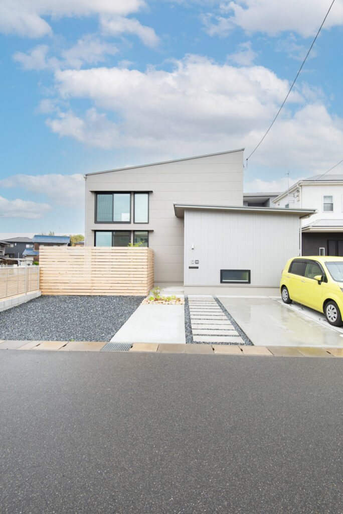 3つの箱が重なったようなデザインの外観は、ガルバリウムや木材など異なる素材を組み合わせて個性を際立たせています。南側道路に面した敷地には、木製フェンスと植栽を配置。外部からの視線をやわらげつつ、室内からは緑を楽しめる設計です。片流れ屋根と水平ラインが街並みに調和し、端正な印象を与えています。駐車スペースやアプローチも無駄なく計画され、機能性と美観を両立しています。