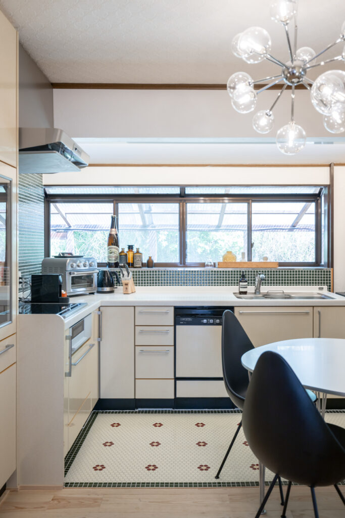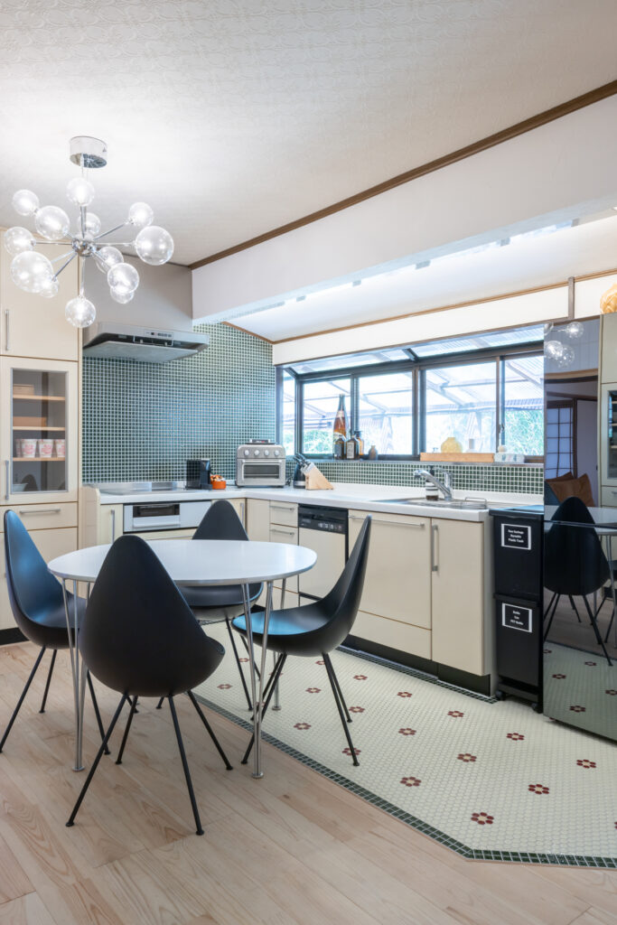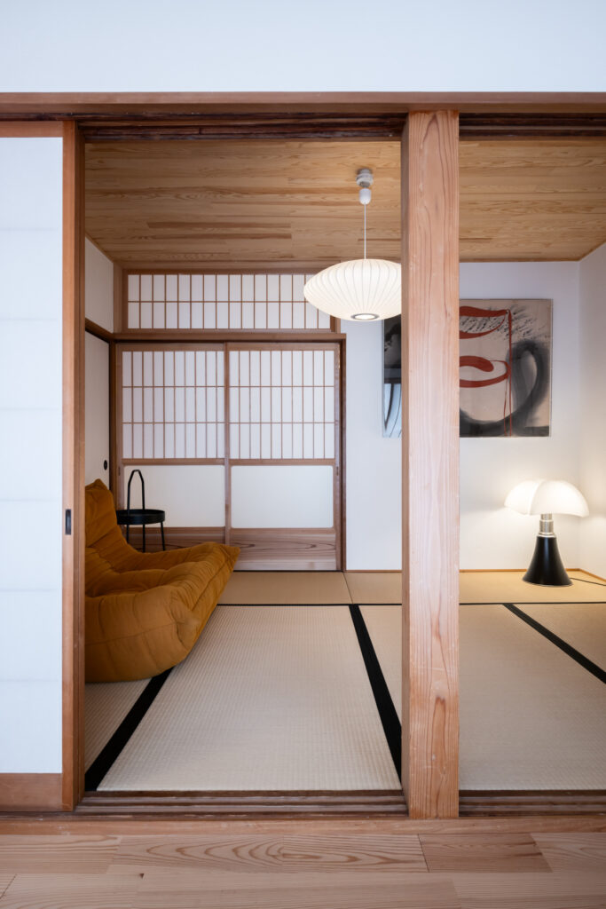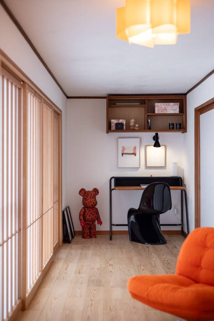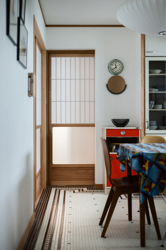 障子や伝統的な和の要素に、フランス人の感性が捉えた「和モダン」が重なり合います。家具はすべて施主自らがセレクトし、空間に完璧に調和しています。アーティストでもあるJUJUさんの作品やコレクションした昭和レトロな雑貨が、どこか懐かしさを感じさせる雰囲気を生み出しました。妥協のない美意識が隅々まで行き渡り、センスの良い家具がモダンな印象を与えています。