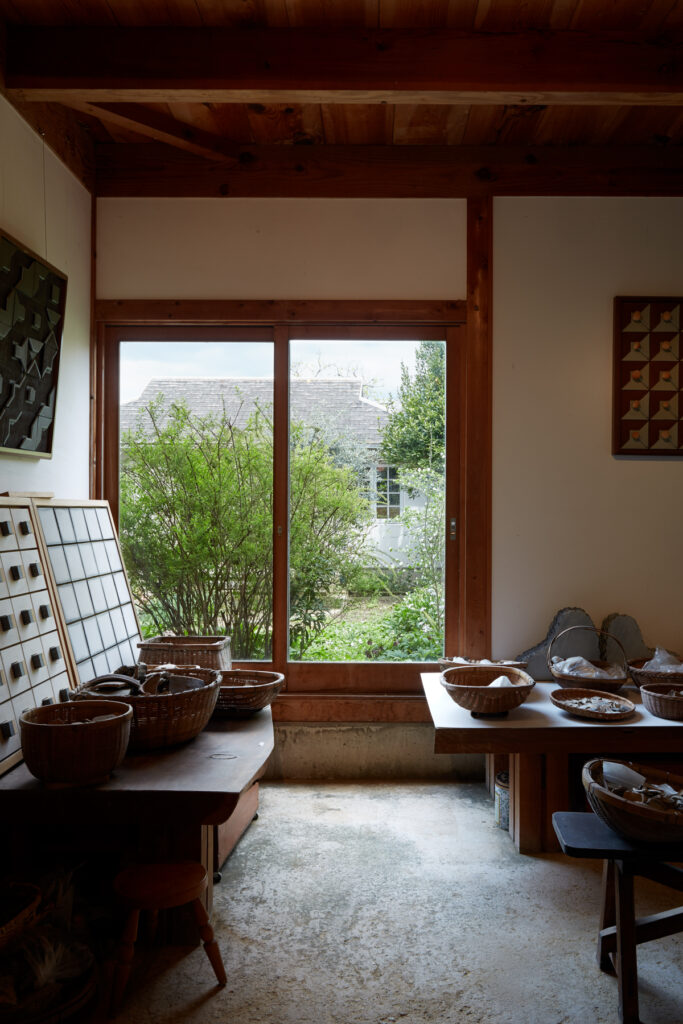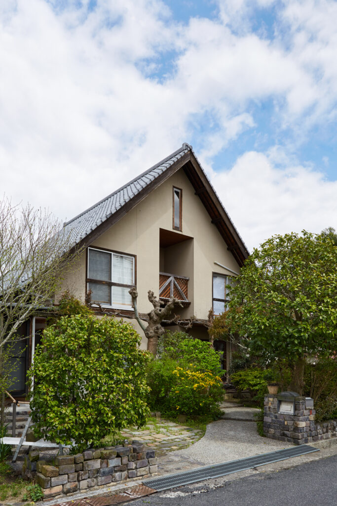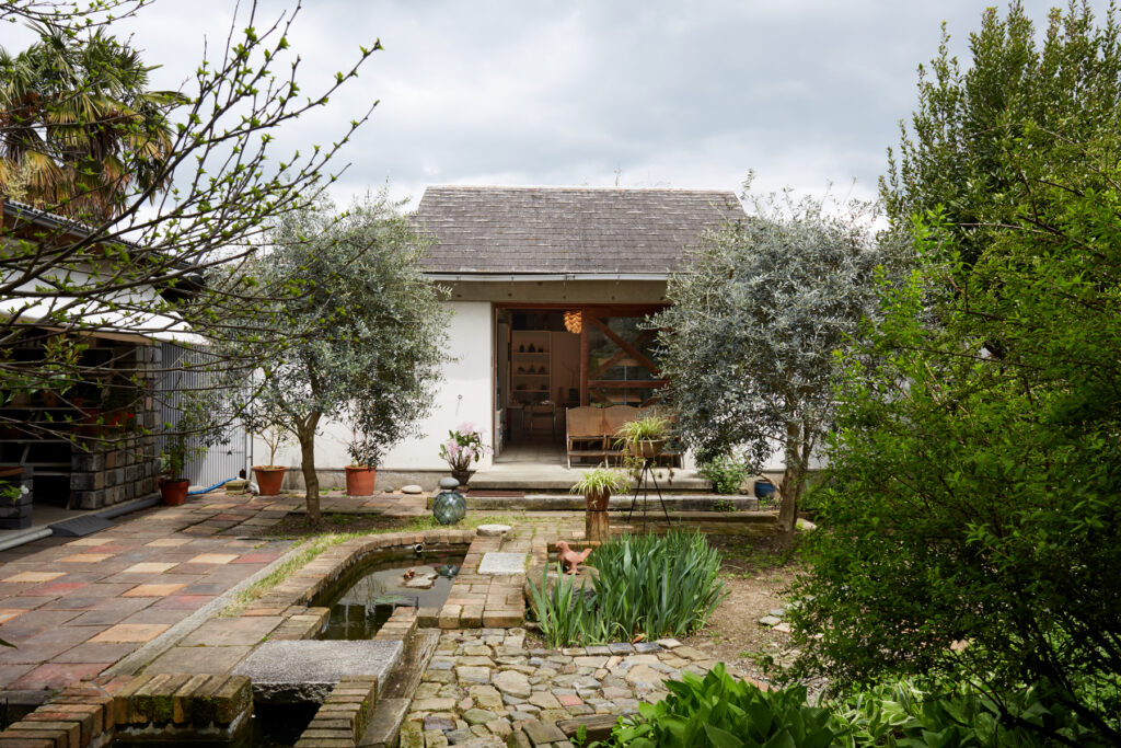 陶云家の0さんが創作拠点を求めて叔父の空き家に移り住み、老朽化した母屋を建て直したのは約40年前のこと。当初は予算に余裕がなく、雨風をしのげる箱になればよいと考えていました。ただ、「岡山の夏はとても暑いのでクーラーがなくても気持ちよく風が抜ける家にしたい」という思いだけは譲れず、試行錯誤の末に三角屋根の印象的な住まいが完成しました。