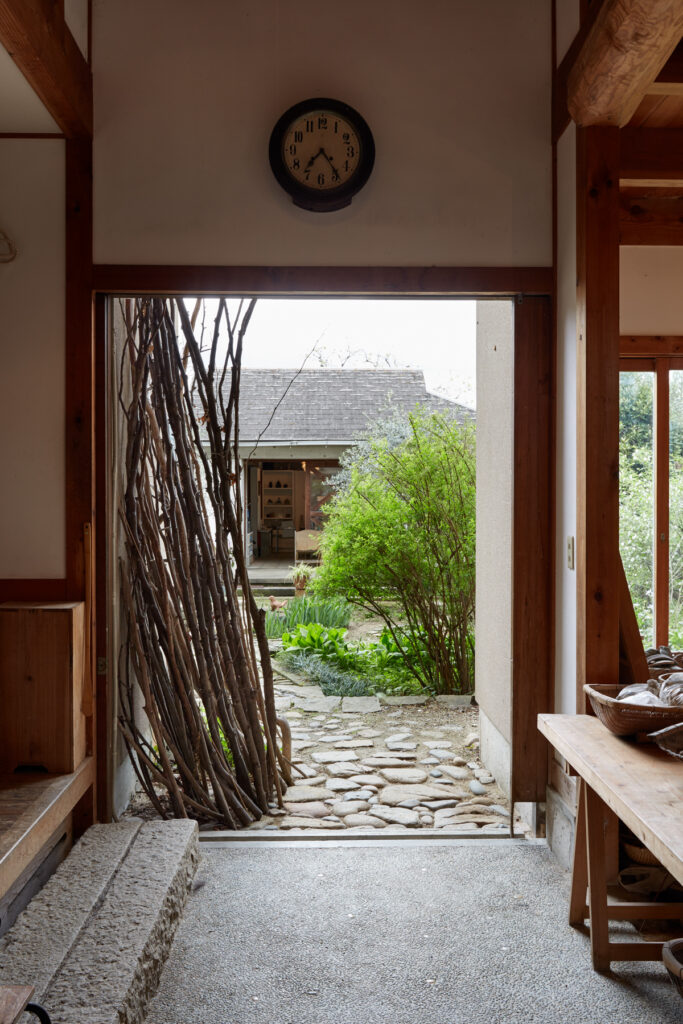 玄関正面に広がる土間スペースは、時にリビング、時に応接間となって使い勝手は抜群です。内外を土足で自由に行き来できるため、訪れた客人をそのまま中庭の奥のアトリエに招き入れられます。玄関と中庭を一直線に結ぶ動線により、玄関に集まった風が対面の開口に引き込まれ、家じゅうをさっそうと抜けていきます。夏の暑さも心地よく癒やしてくれます。