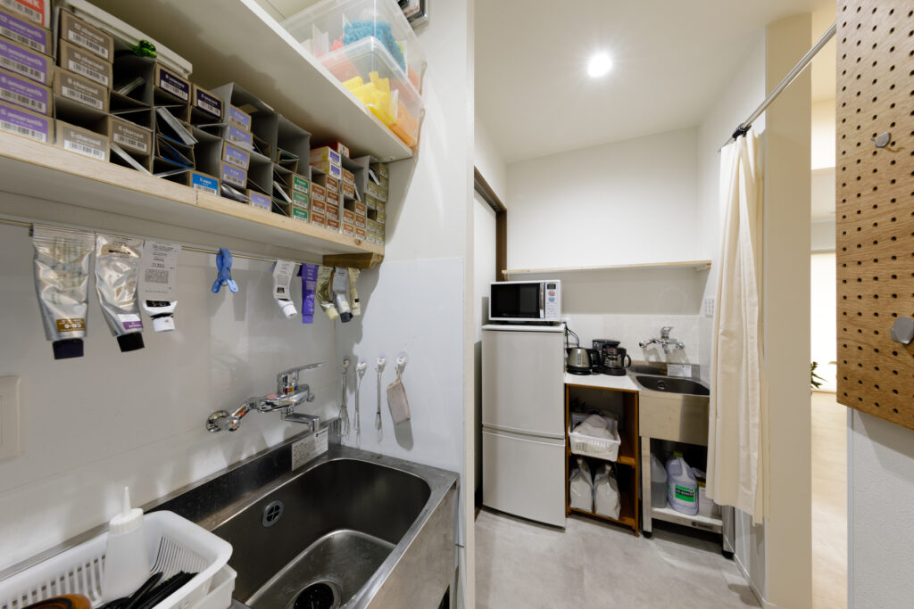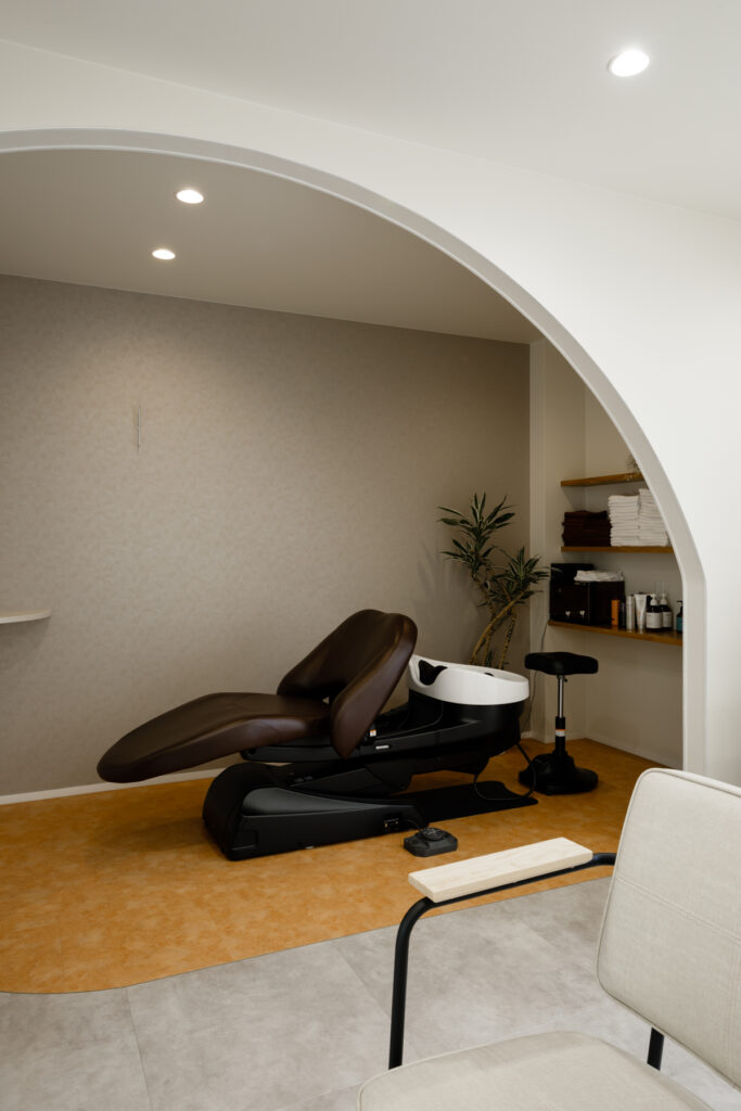 ワンフロアにシャンプー台とスタイリングチェアを配した、無駄のないシンプルな空間。プライベートサロンとして、お客さま一人ひとりに寄り添う施術を大切にしています。削ぎ落とされた構成が心地よさを生み、清潔感のある空間が自然とリラックスへと導きます。機能性と美しさを兼ね備えた設計です。