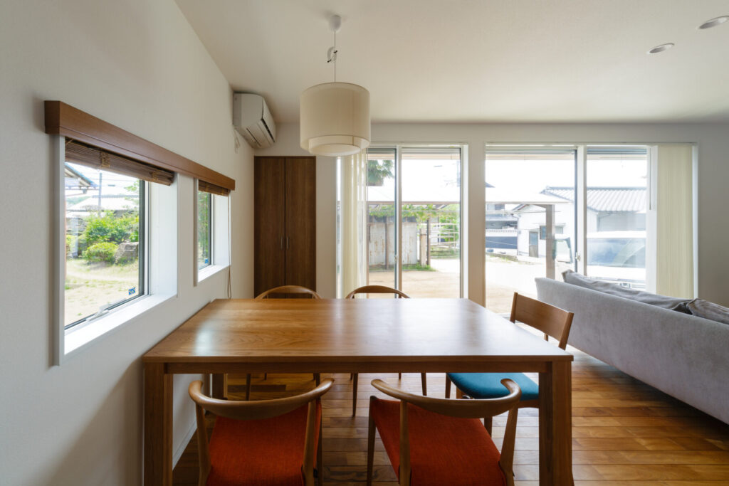 パッシブにこだわった分、内装などのデザインはあくまでもミニマムでシンプルに。すっきりと白ベースのLDKは広々とさえ感じられます。冬の間も小さなエアコン1台でポカポカと快適に過ごせるのは、自然の恵みを生かした設計のおかげです。「ゆったりくつろげる雰囲気のリビングに友人たちを招きたい」というご主人の思いもかなえられました。
