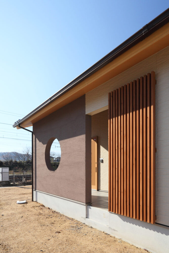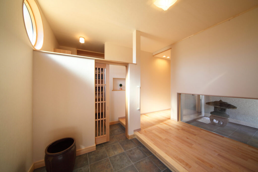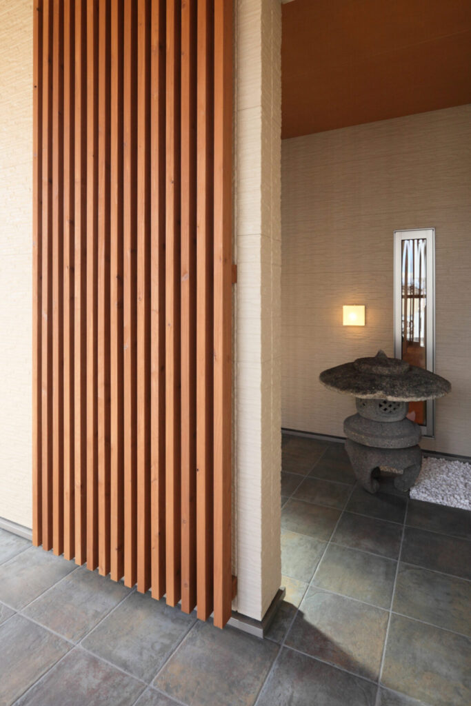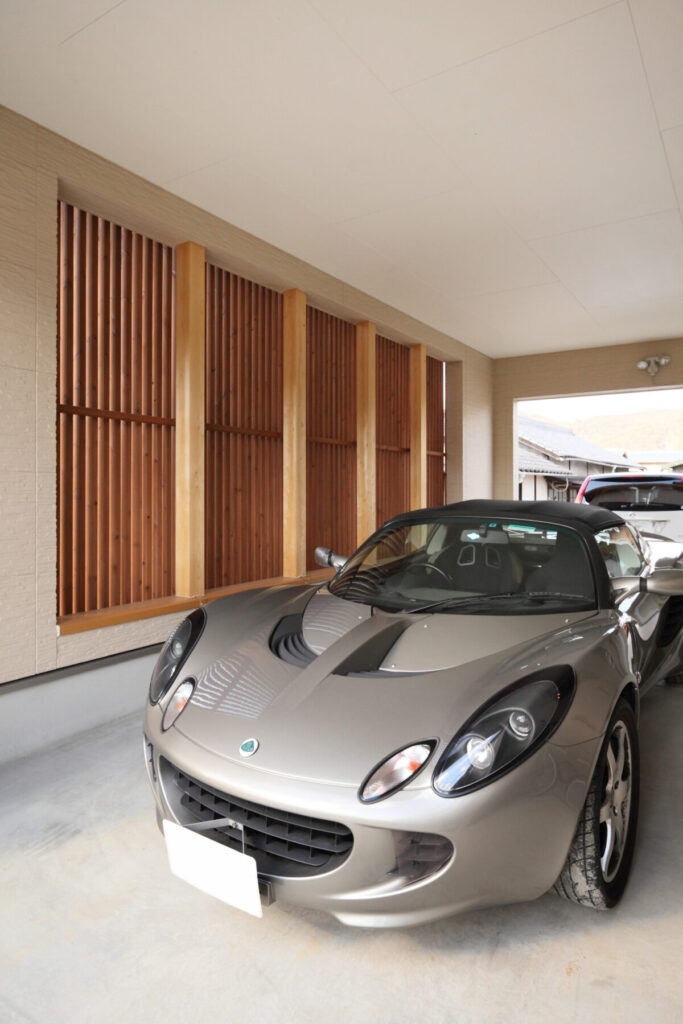 あずき色の外壁に丸窓が映える和の邸宅に、シルバーのスポーツカーが美しく鎮座。重厚な造りのガレージは、キッチンの勝手口から直接出入りできる利便性も兼ね備えています。千本格子越しに隣地の緑を楽しみながら、バーベキューやお子さまの遊び場としても活用できる場所です。