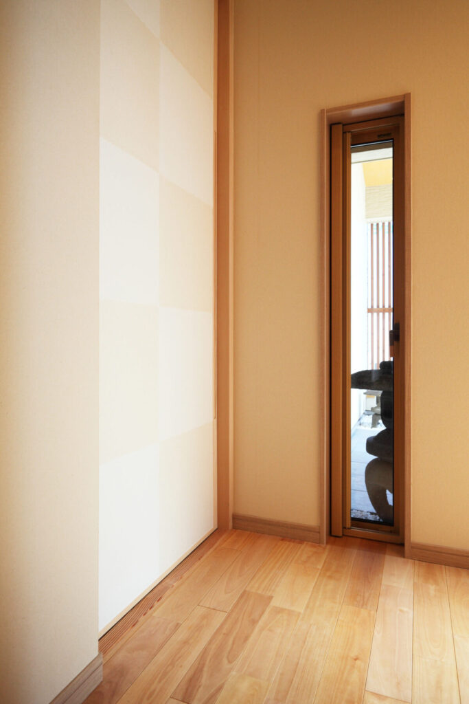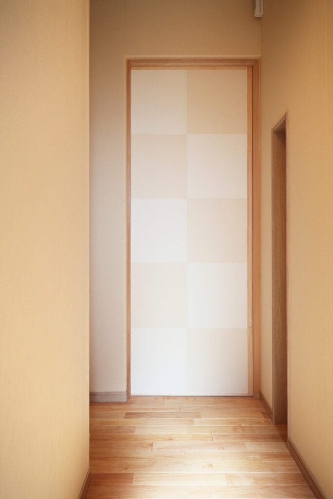 和室入り口の建具。微妙な色違いの和紙を市松に貼り重ねて、淡く繊細な表情に。