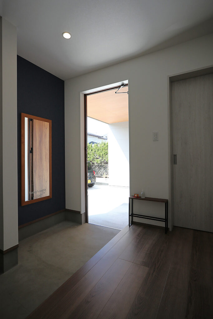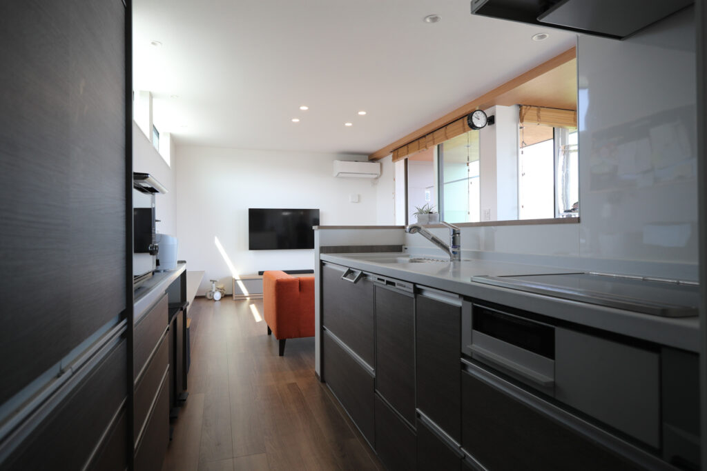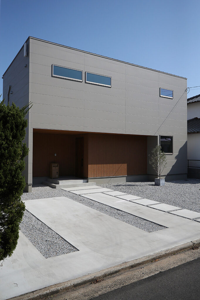 地元で育った同級生同士のSさんご夫婦が選んだのは、瀬戸内海を見渡せる崖の上の土地でした。なじみ深い海と島々の風景を最大限に取り込もうと、思い切って2階にリビングを配置。外観から室内まで、ふたりが好む落ち着いたグレー系で統一し、シンプルな色調が窓の外の青を一層際立たせています。